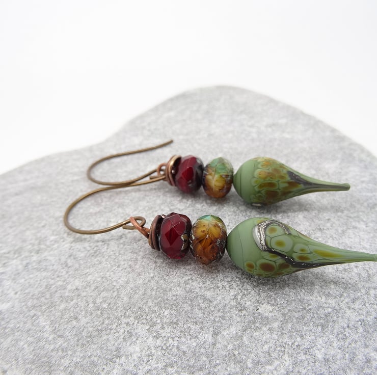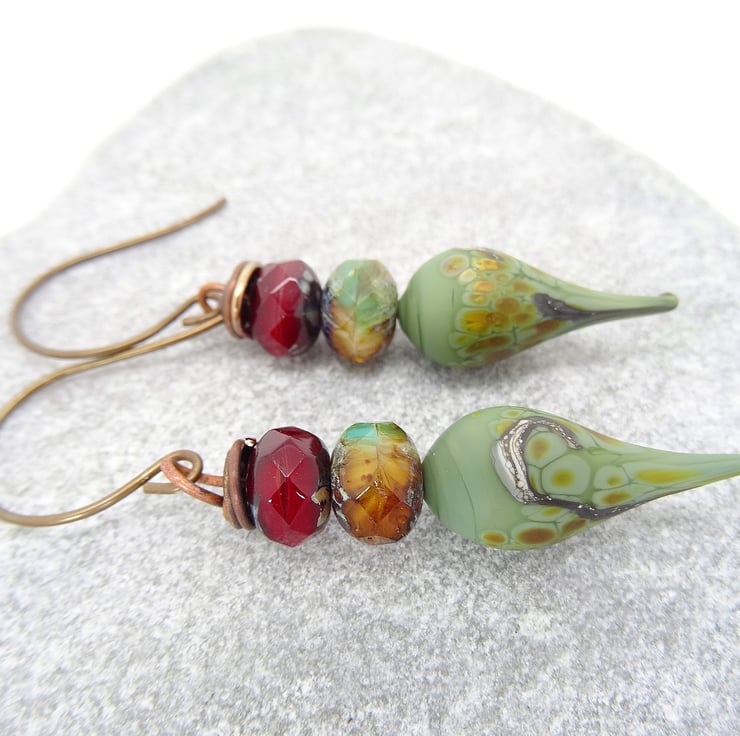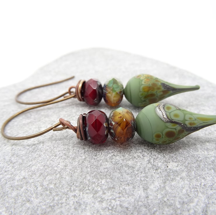 These are beautiful earrings which have a bohemian, rustic look. I have made them using handmade lampwork spikey droppers by artisan Elasia .The drops are etched in a sage green colour with a brown and amber pattern, to these I have wired 9 x6mm czech glass rondelle beads in burgundy and green/amber colours. The earrings measure 2 inches (5 cm) from top of vintaj brass, round loop, nickel free earwires.
