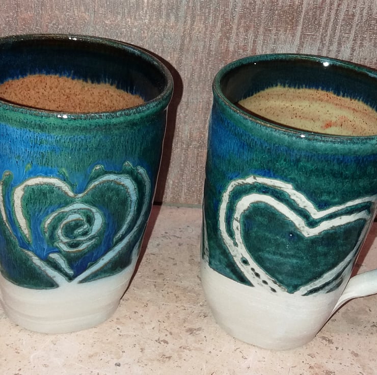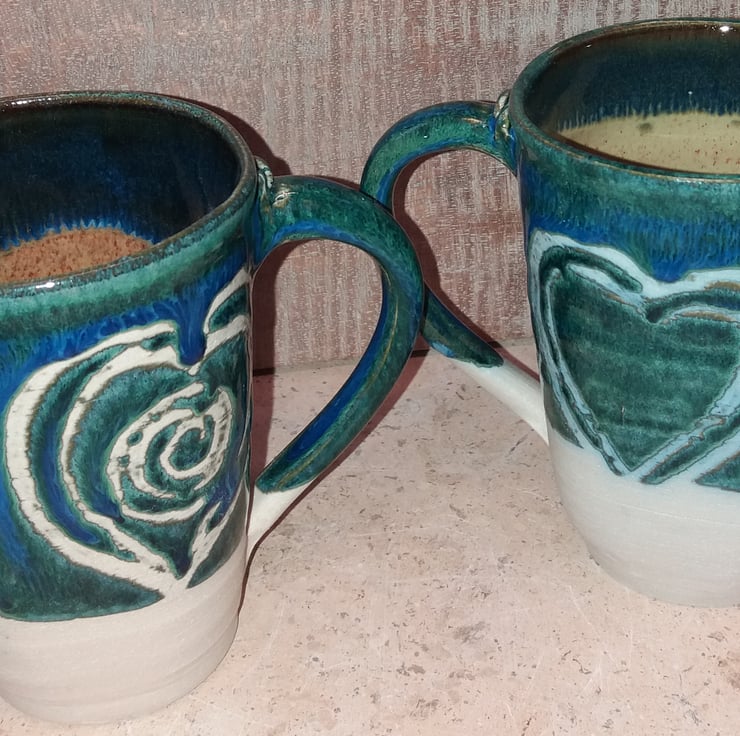 Glossy sea green mugs with scrafitto hearts and spiral decorations