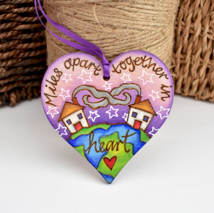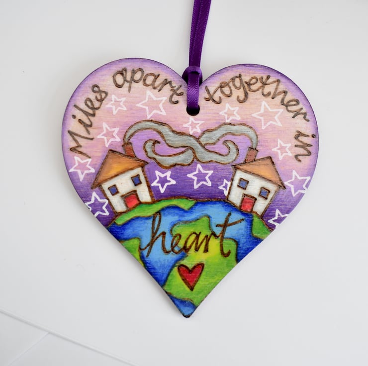 One moving away or new home themed heart reading 'Miles apart, togther in heart'. ideal sentiment for a long distance friendship. Ready to be personalised on the reverse. Hand burned using pyrography and coloured using vibrant blended prismacolor pencils.
