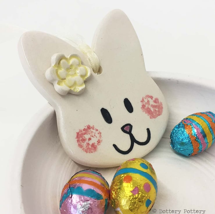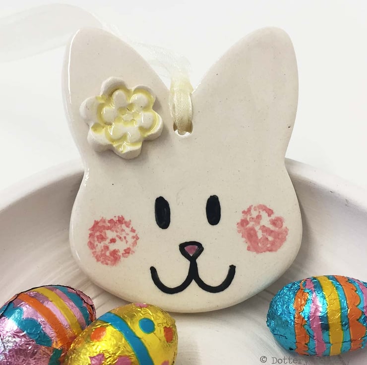 This pottery bunny decoration is made from white earthenware clay and decorated with a little flower,
