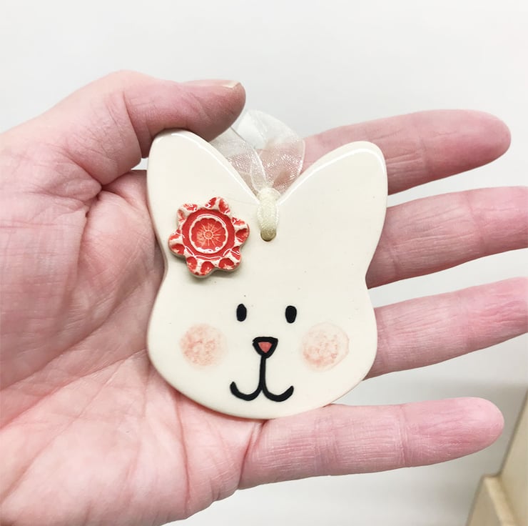 This pottery bunny decoration is made from white earthenware clay and decorated with a little flower,