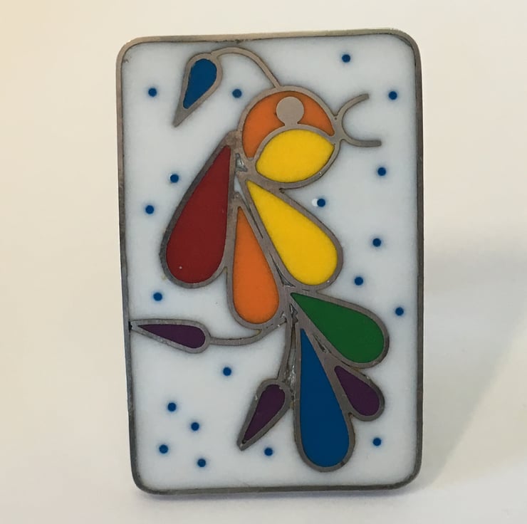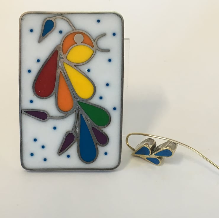 A Rainbow bird pendant and brooch in brass and resin.HALF PRICE