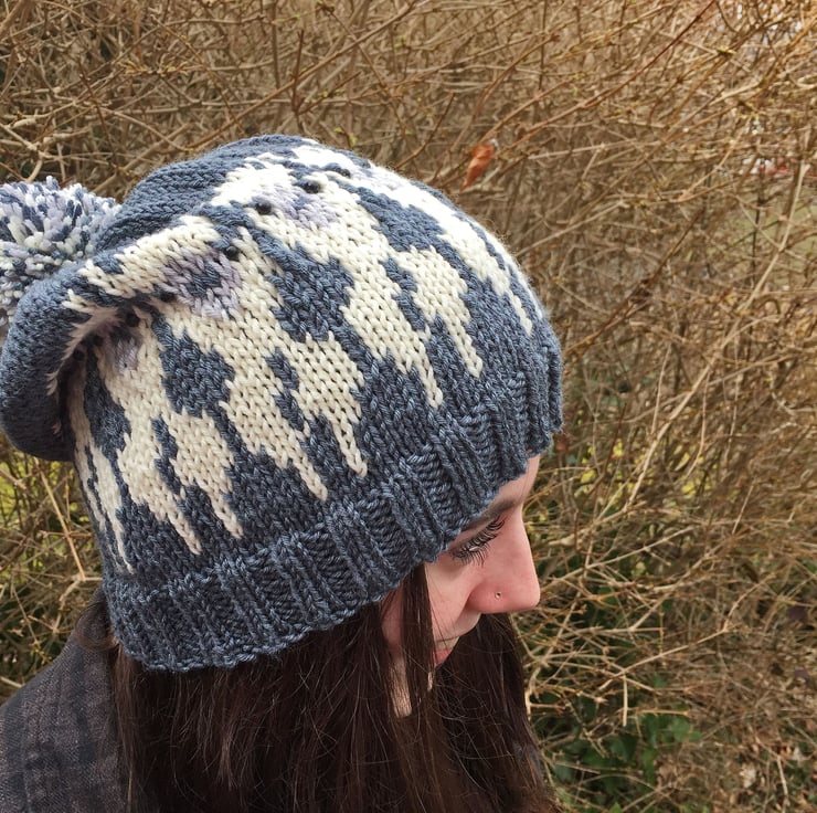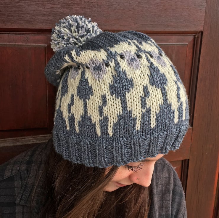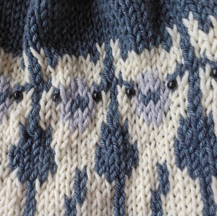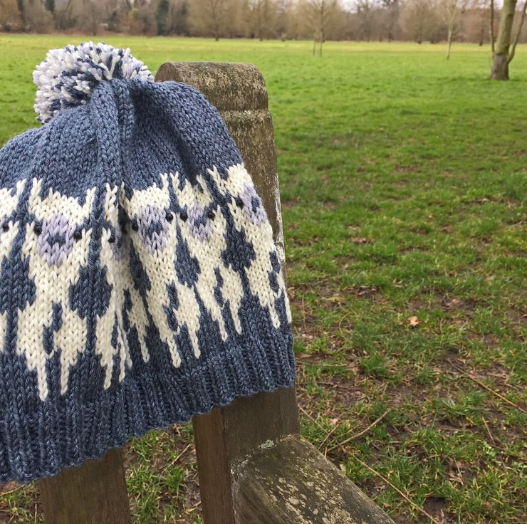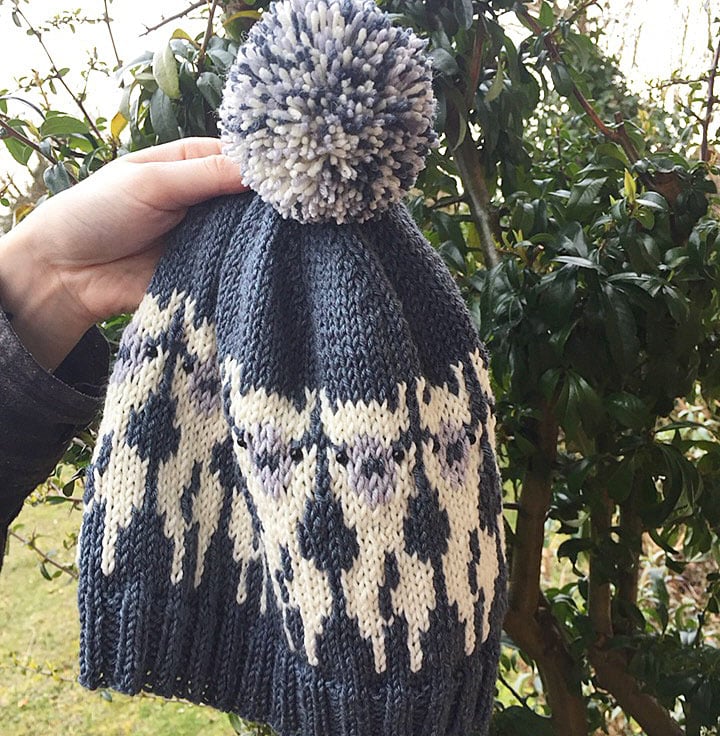 This cute alpaca themed hat was inspired by the popularity of my Woolly Sheep hat pattern. It has a ribbed welt and a stocking stitch body with a stranded colourwork alpaca repeat pattern encircling the lower section of the hat body. Beads are used for the alpacas’ eyes, although these are optional.
