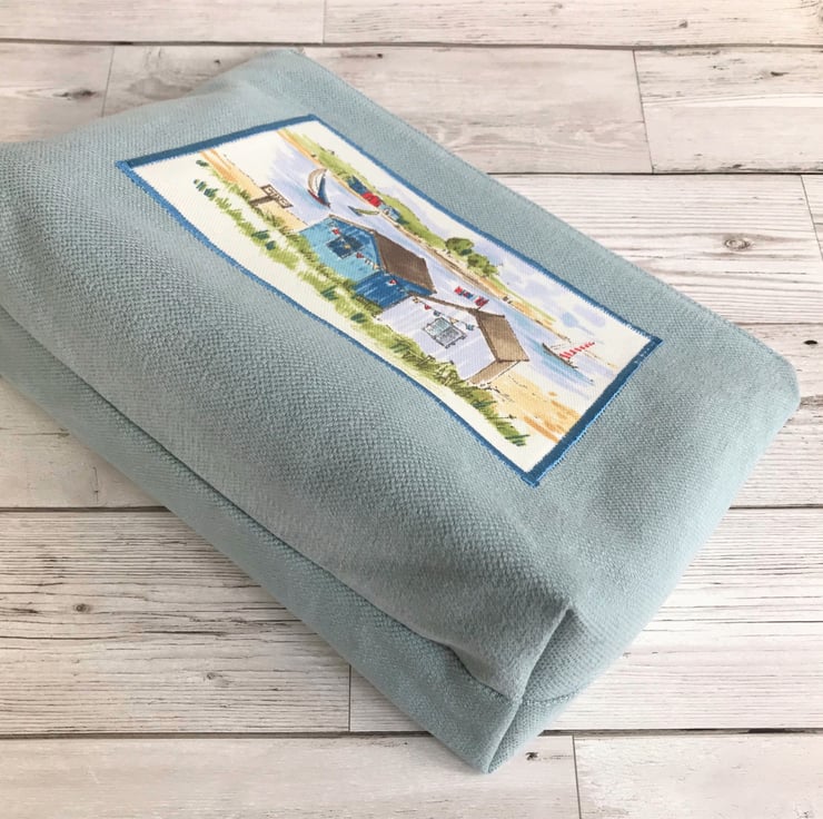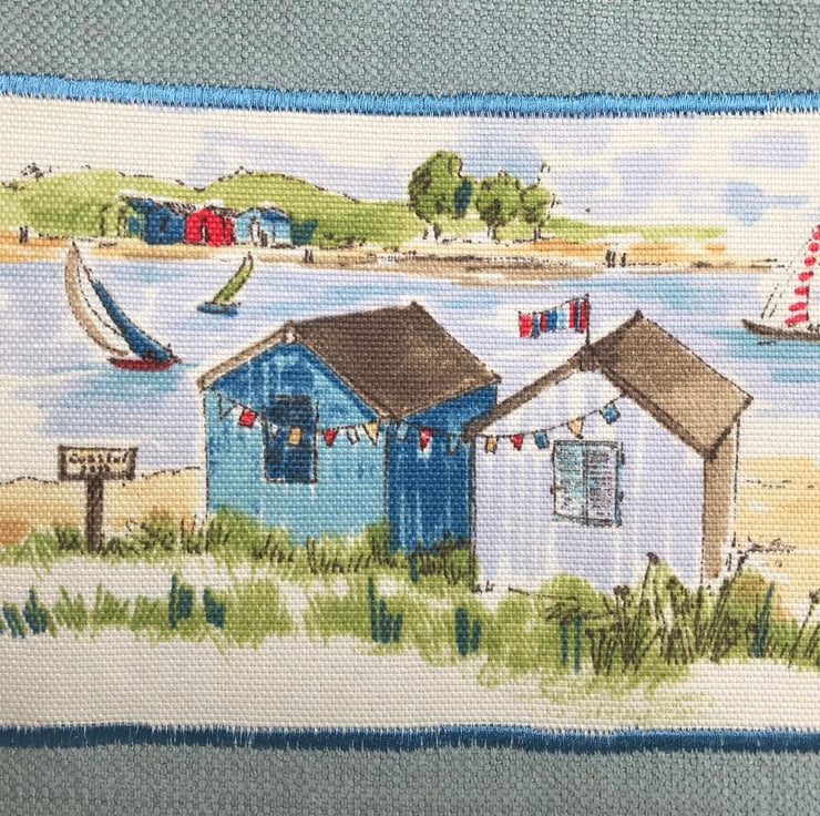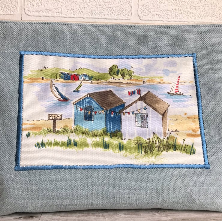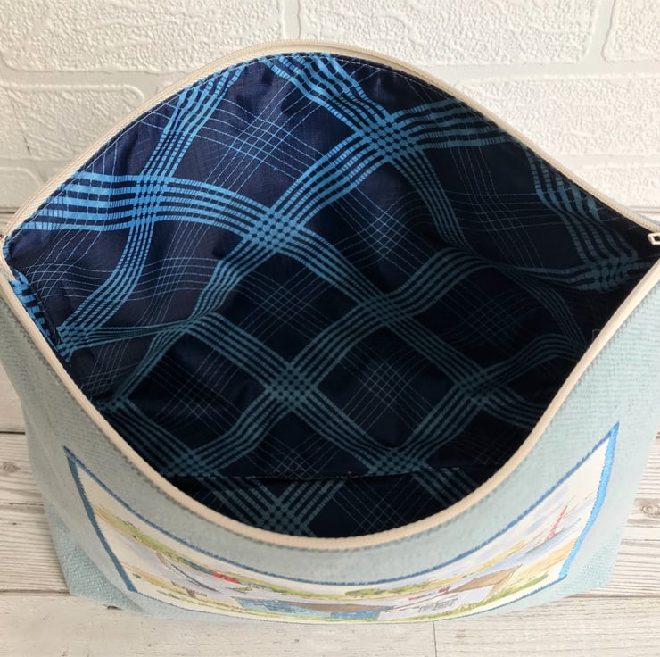 A beach huts toiletry bag. This lovely wash bag is made from pale blue fabric with a decorative print panel. The panel features a delightful pattern featuring a coastal scene including two beach huts, boats and bunting. The colours are typically coastal in shades of blue, golden yellow, green and red. The panel is edged with blue machined satin stitch. The bag has a cream zip and is fully lined with a water-resistant lining. The lining is blue with a paler blue lattice pattern. The base of the bag is boxed giving lots of space inside.