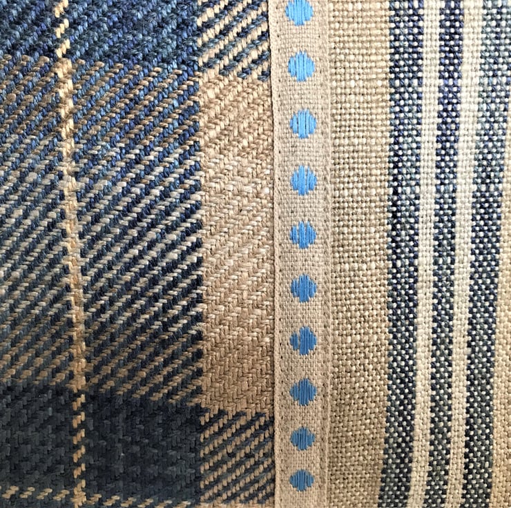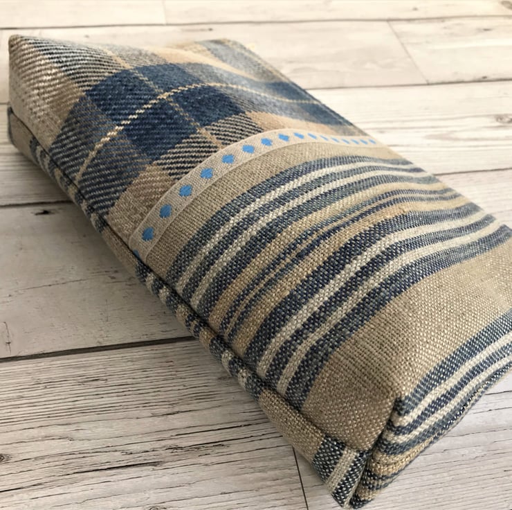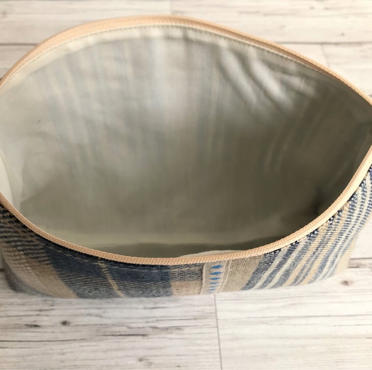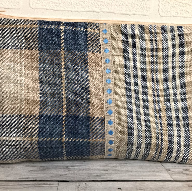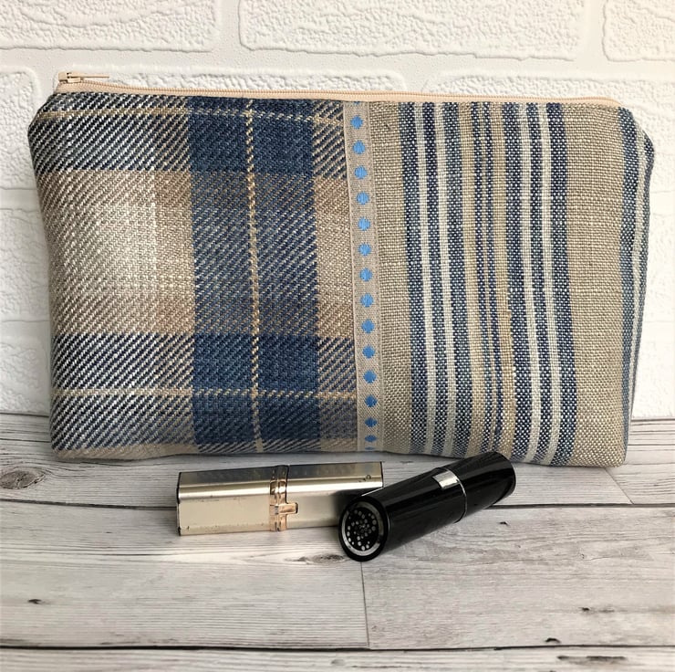 A large cosmetic bag in two co-ordinating fabrics. One half of the front is a lovely blue, beige and cream tartan tweed fabric and the other half is a striped fabric in similar colours. Where the two fabrics meet, the bag is embellished with beige twill ribbon with a pattern of bright blue diamonds. The back of the bag is made from the striped fabric. The make up bag has a cream zip and is lined with cream fabric. The base of the bag is boxed giving lots of space inside.