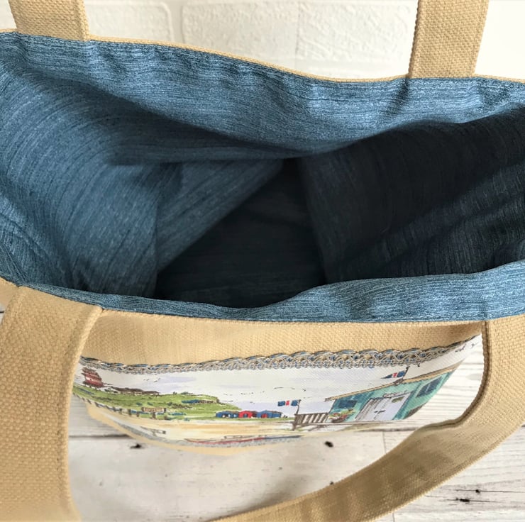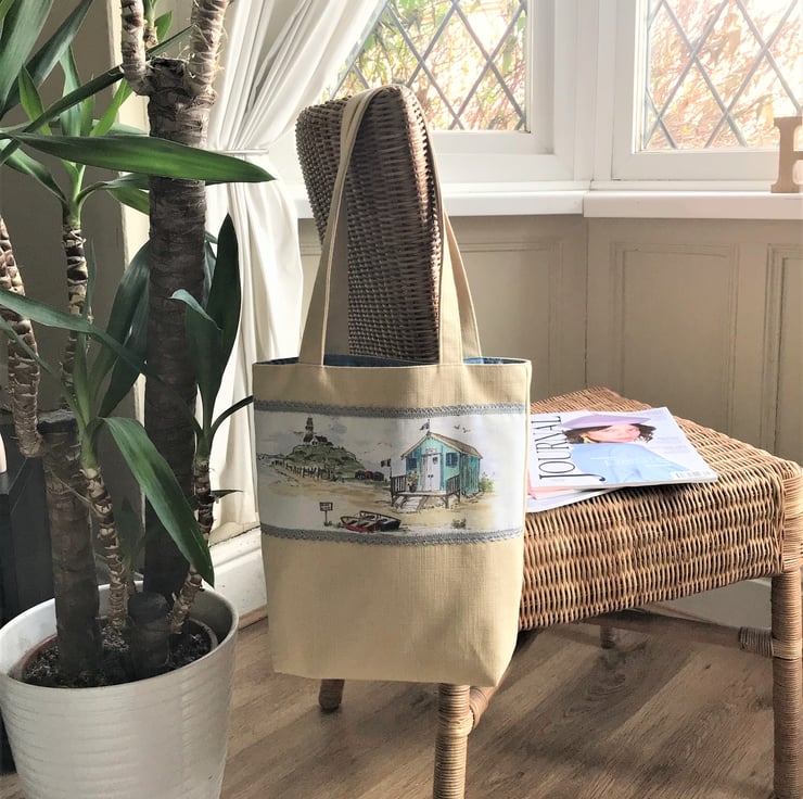 This bag is very versatile - perfect for use as a tote bag, handbag or shoulder bag. With its delightful coastal print panel, it would make a lovely gift, particularly for someone who loves beach huts or the coast.