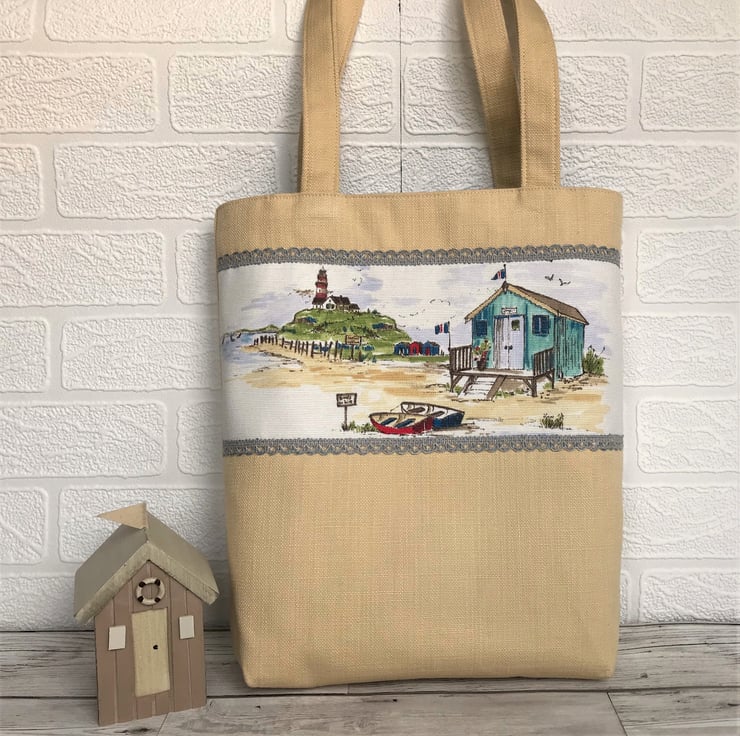 A tote bag in a pale golden yellow fabric with a horizontal decorative panel on the front. The panel features delightful coastal scene with a large beach hut, smaller beach huts in the distance, a lighthouse and two boats. The colours are typically coastal in shades of blue, turquoise, golden yellow, green and red. The top and bottom of the panel is edged with blue and beige lacy ribbon. The bag is fully lined with blue fabric.