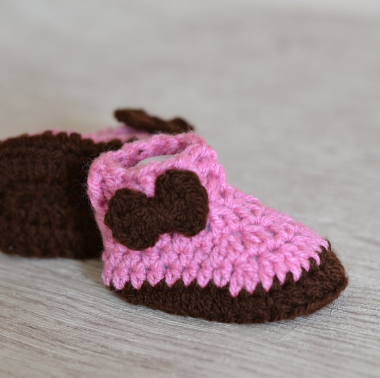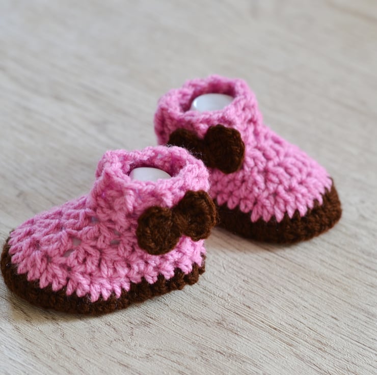 Newborn girls crochet baby shoes. Made in 100 % acrylic dk. The sole and flower are made in brown with the main part in rose pink They have a mock cable design at the top part of the part and are finished with a crocheted bow which I have sewn to one side of each boot.