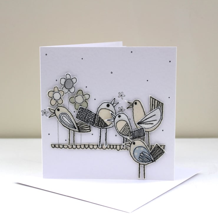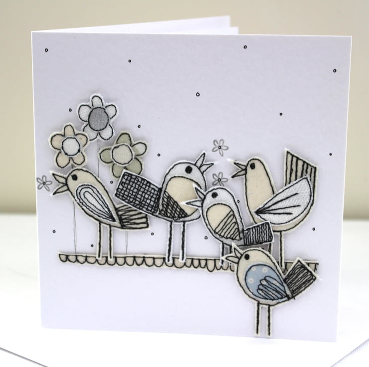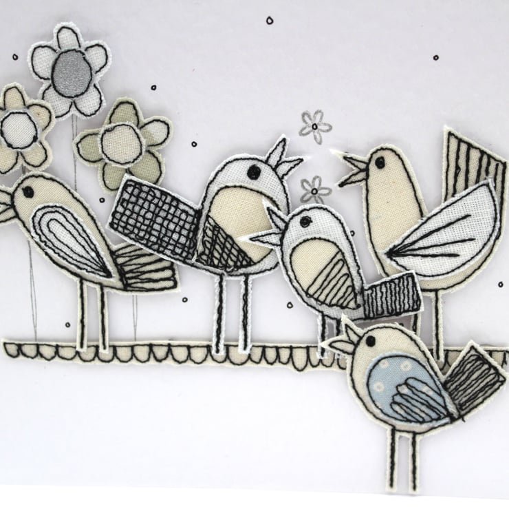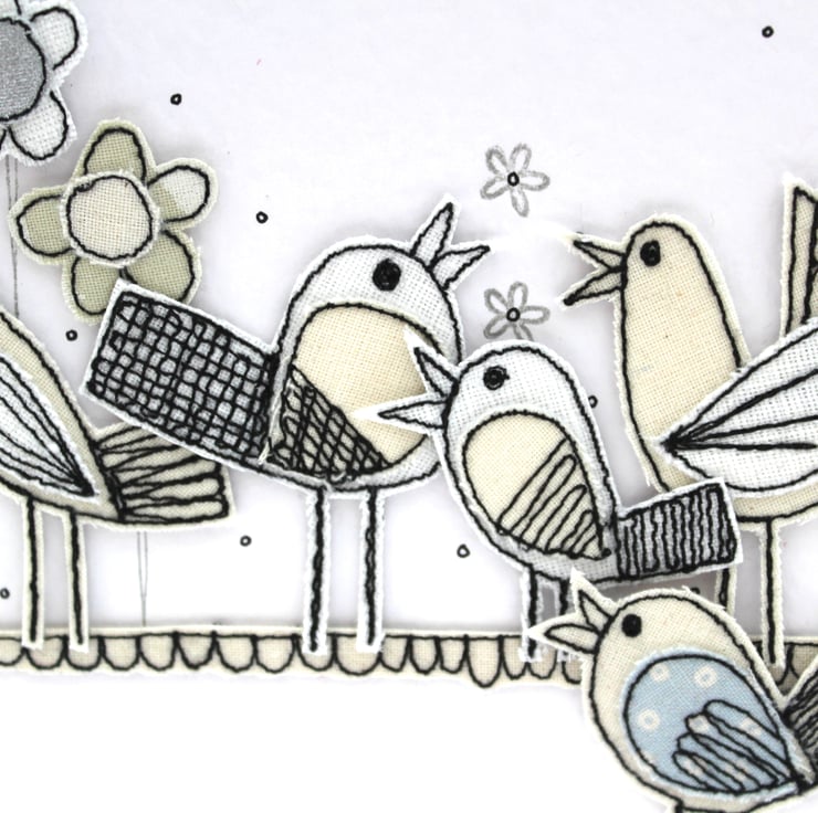 Freehand machine embroidered birdies and flowers are created using cotton cloth, linen and felt. They stand on a scallopped ledge and are surrounded by hand drawn flowers and dots.