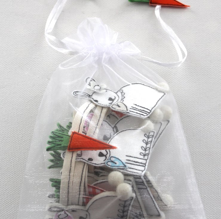 Bunny bunting is presented in a organza drawstring bag with a carrot on each ribbon.