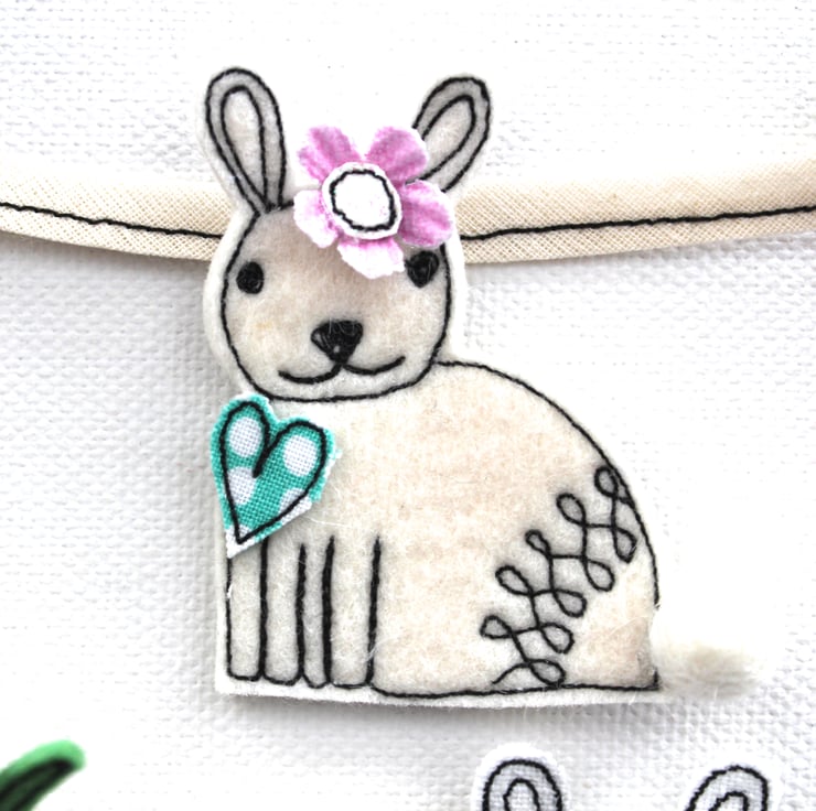 Each bunny is sewn using either linen, cotton of wool felt cloth, has a heart suspended from each and a paper flower.