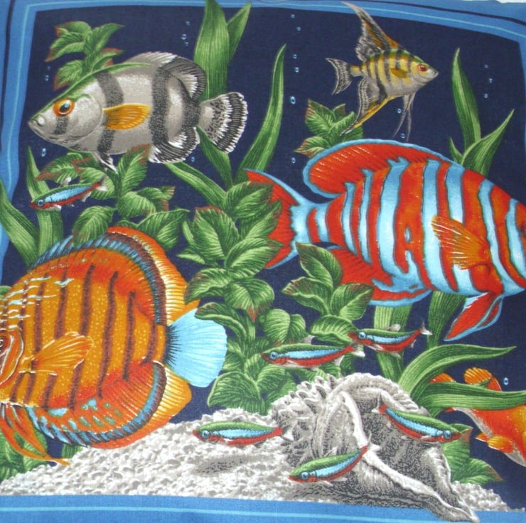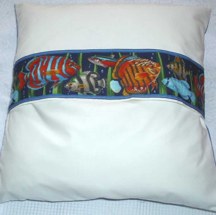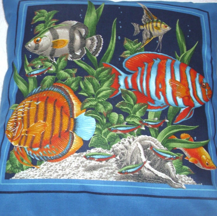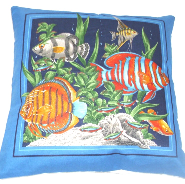 From the Sea bright colourful Tropical fish cushion with butterfly fish, neon tetras, angle fish swiming among sea plants deep in the ocean.