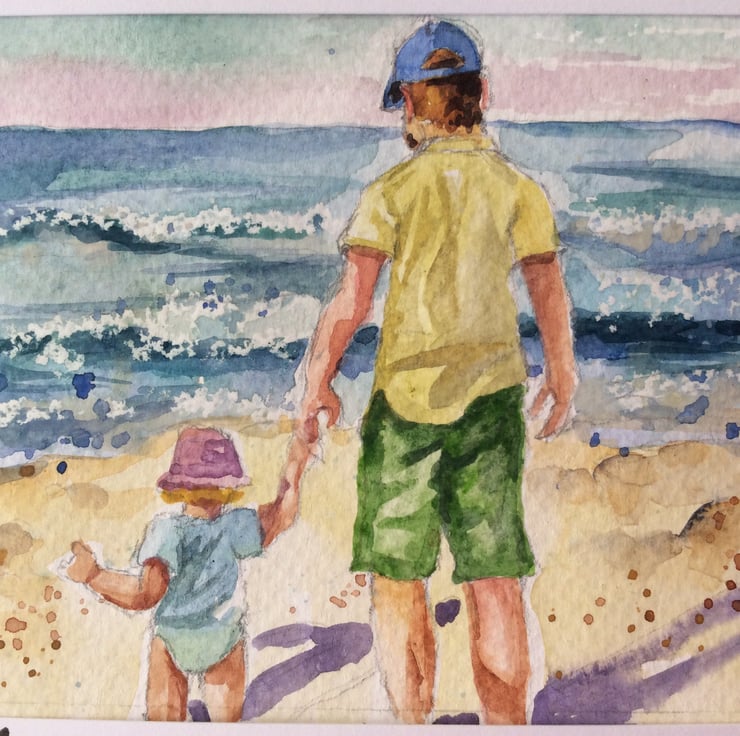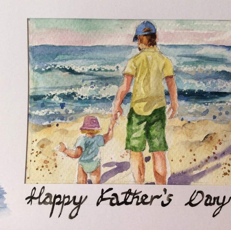I love making one off cards so the recipient receives a card that is completely unique which hopefully makes them feel very special! This handmade card consists of an original watercolour painting and not a print. The painting has been painted on watercolour paper and mounted in a window framed card so after it has been displayed the painting can be easily removed and framed as an original piece of artwork. The painting depicts a father and daughter on a beach walking down to the sea. I use a range of watercolour techniques such as wet on wet and wax resist have been used which are unique to my style of artwork. A small boat has been painted on the card mirroring the main theme of the painting. The card has been left blank inside for your own personal message and comes with an envelope. The card measurements are approximately 20cm x 15cm.