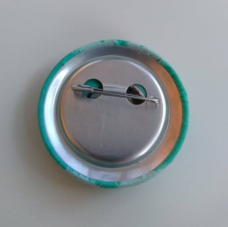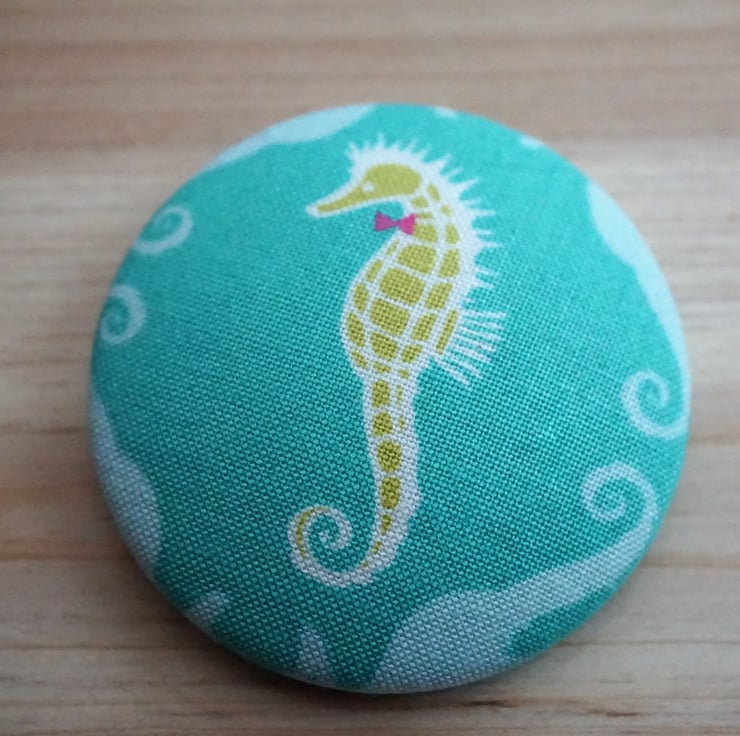 This is a large fabric covered badge/brooch with a beautiful seahorse design on a turquoise background. It is 5 cm diameter and has a safety pin fasten. The badges look great on a jacket, bag, sweater, scarf and much more.