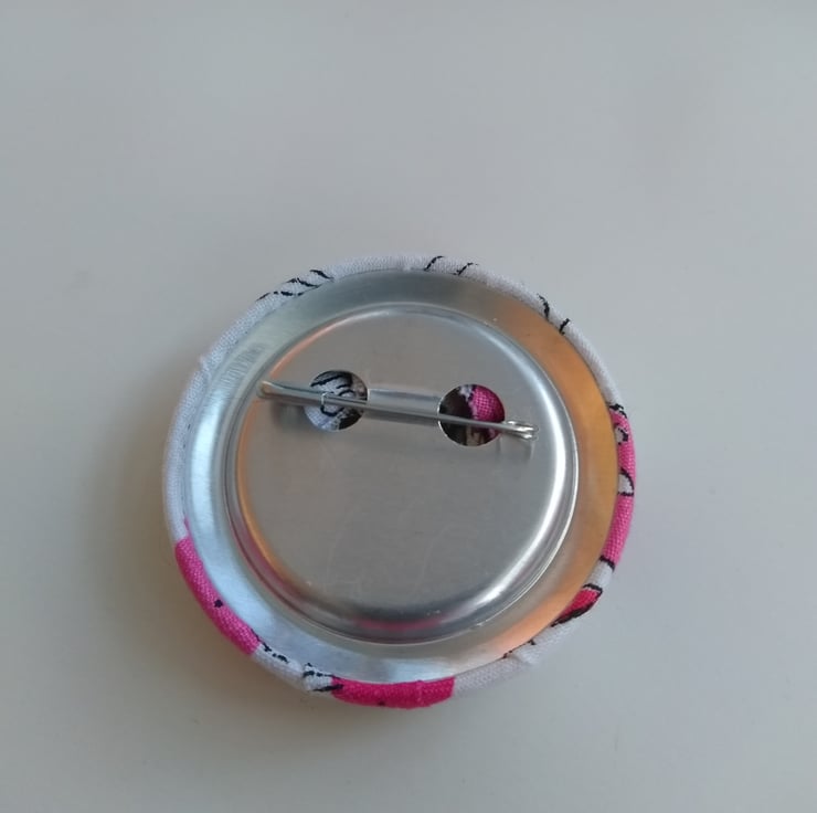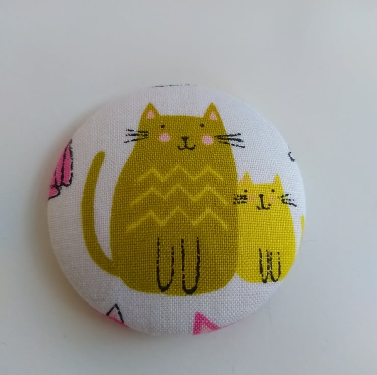 This is a large fabric covered badge/brooch with a beautiful cat and kitten design on a white background. It is 5 cm diameter and has a safety pin fasten. The badges look great on a jacket, bag, sweater, scarf and much more.