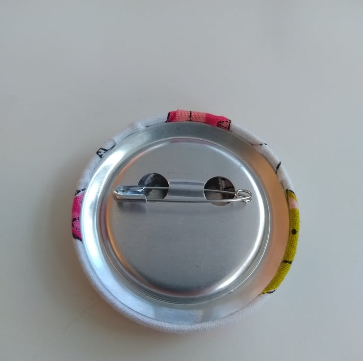 This is a large fabric covered badge/brooch with a beautiful pink cat design on a white background. It is 5 cm diameter and has a safety pin fasten. The badges look great on a jacket, bag, sweater, scarf and much more.