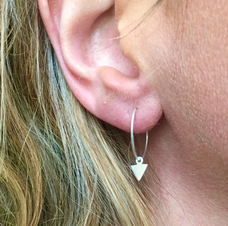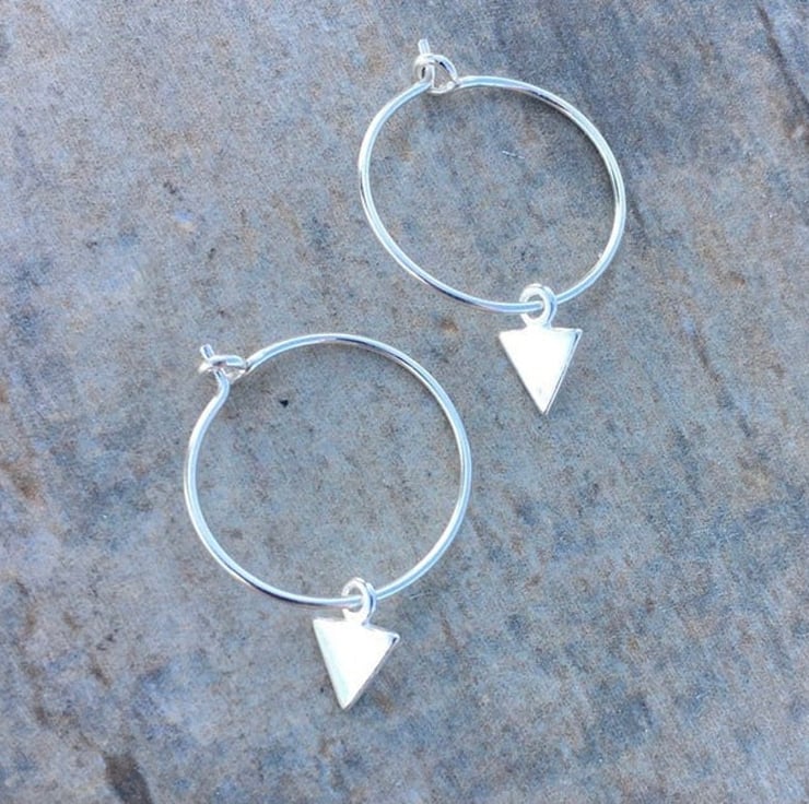 15mm Sterling silver hoops with Sterling silver triangle charms. Wrapped in tissue paper and in a free gift box tied with ribbon.