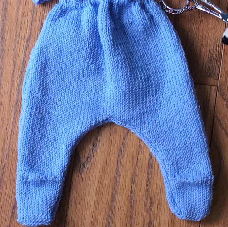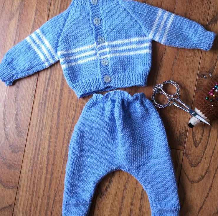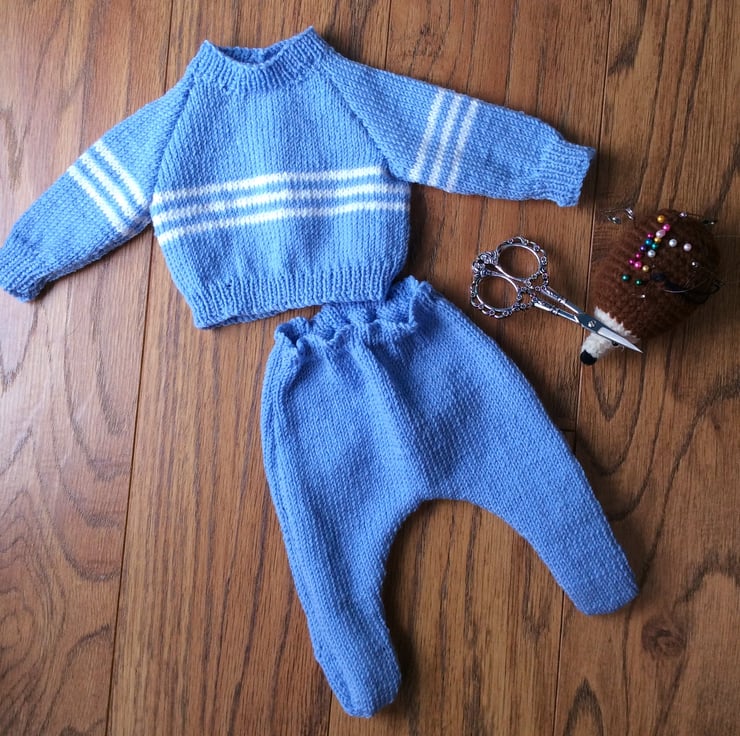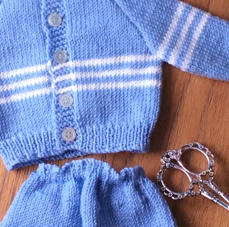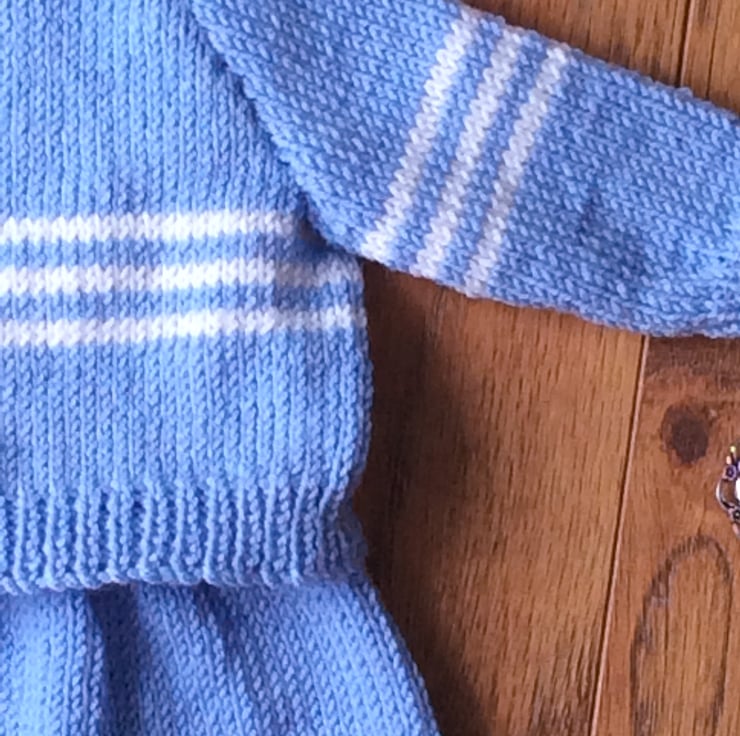 This little hand knitted set is in blue with a contrasting white stripe in both the body and sleeve of the sweater