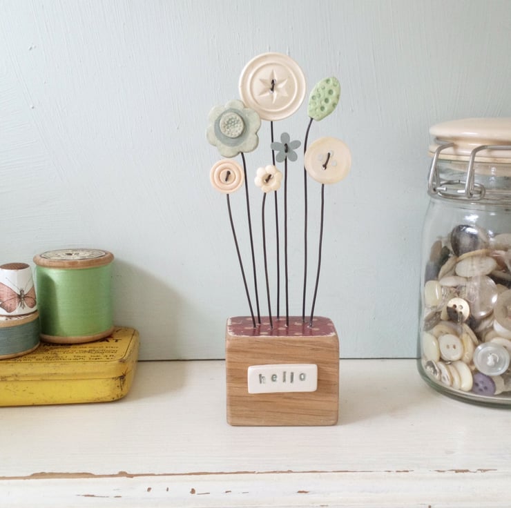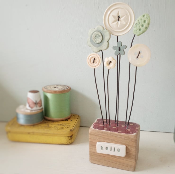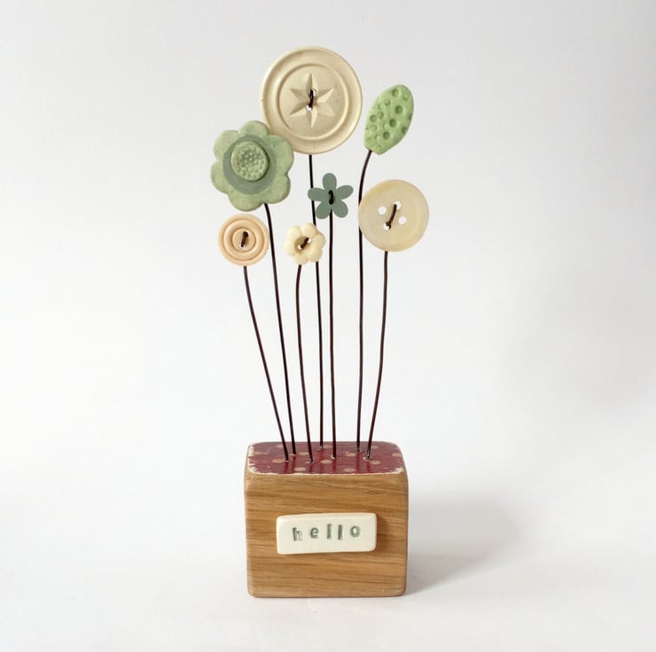 Button and clay flowers and a little leaf grow in this flower garden, standing on their wire stalks in a painted oak wood block with a decoupaged surface.
