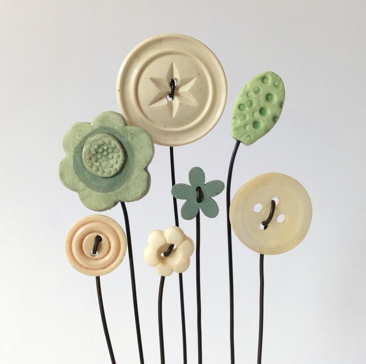 There are five little button flowers with a leaf and a flower handmade from polymer clay. This is moulded and patterned, fired and hand painted to finish.