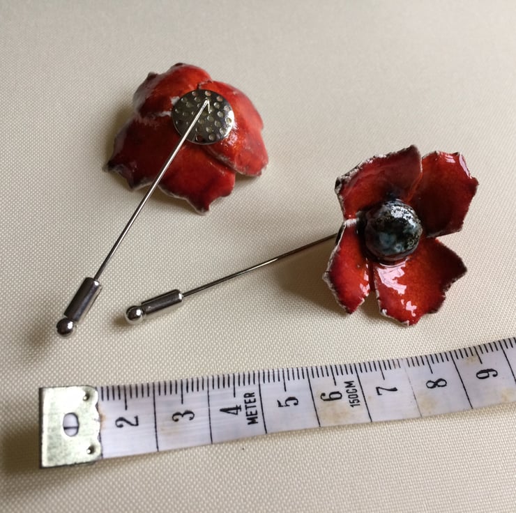 The petals and the centres of these ceramic brooches are made individually from a quality fine white clay and i do not use moulds. The poppies therefore vary slightly in petal size and shape, this makes them unique and no poppies are ever the same. The photos show the slight variations in the poppy brooches that i make.