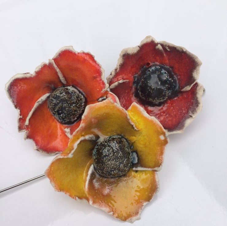 They have been fired in a rich Red glaze colour on the petals with a dark metallic pewter coloured centre. I have also made variations of the poppy with a Yellow glaze and an Orange glaze, please see photo's.