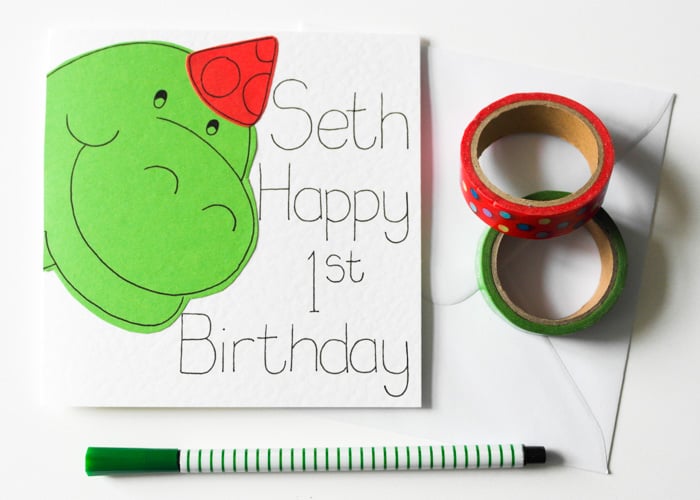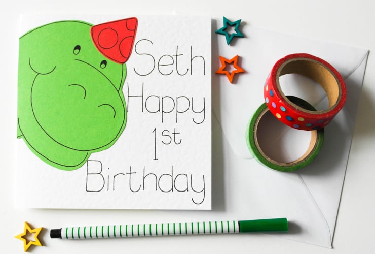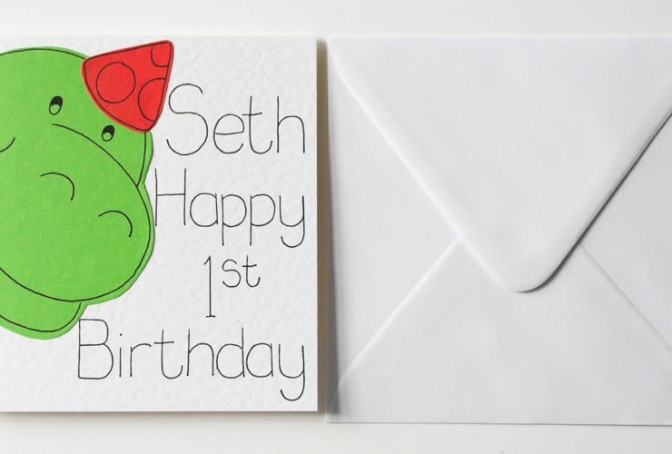 A cute personalised dinosaur first birthday card.