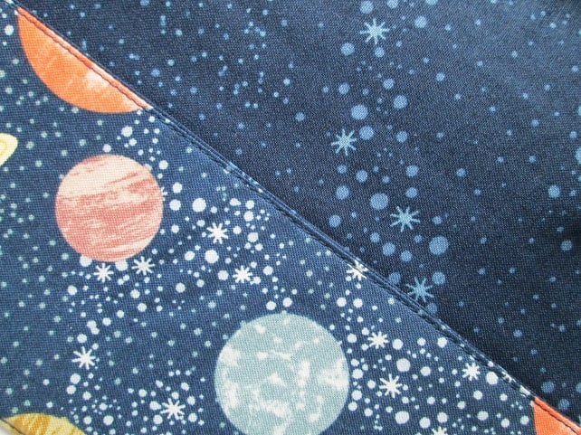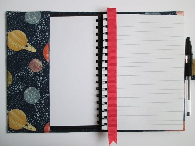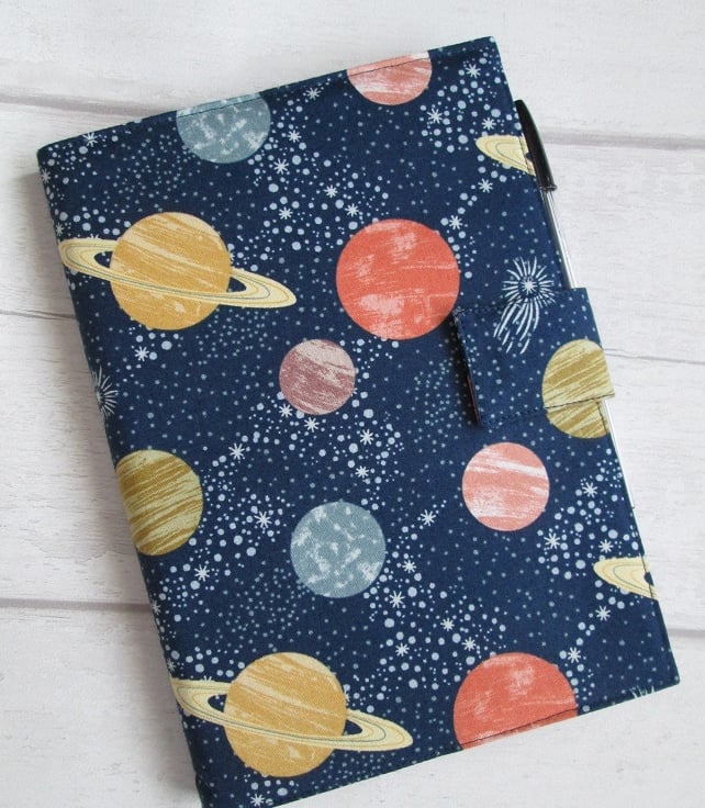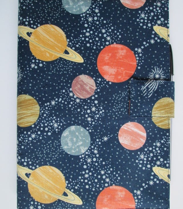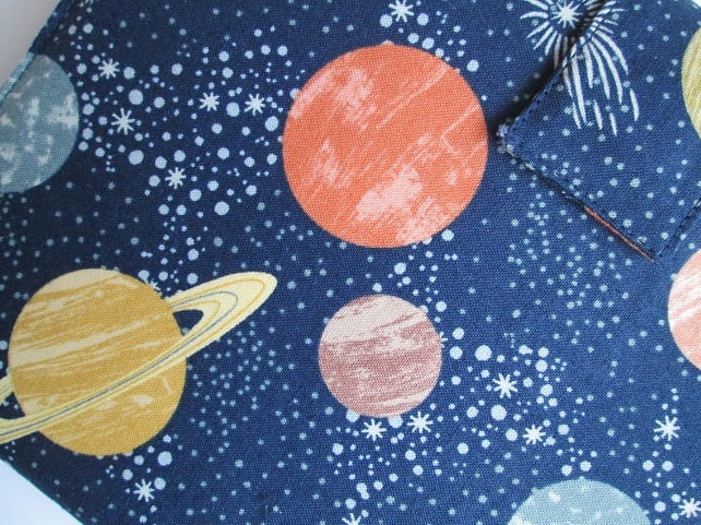 Just the thing for a budding rocket scientist or astrologer, a notebook cover made from a stars and planets print on navy blue. I've lined it with a coordinating navy print and added a ribbon place marker, pen holder and magnetic strap fastening.
