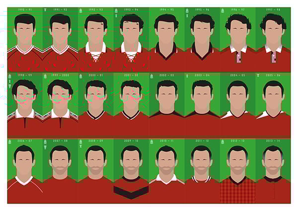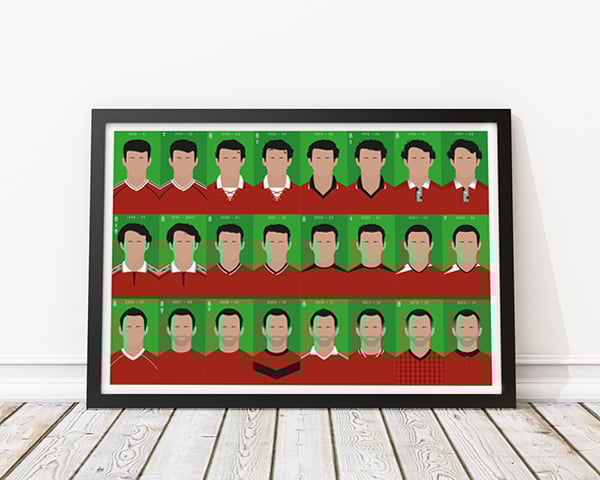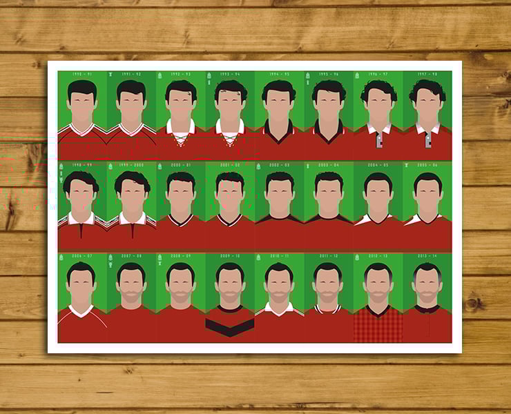 This poster shows Ryan Giggs from his debut in 1990 to his final season in 2013-14. Re-live all the home Manchester United kits, all the trophies and all the haircuts!