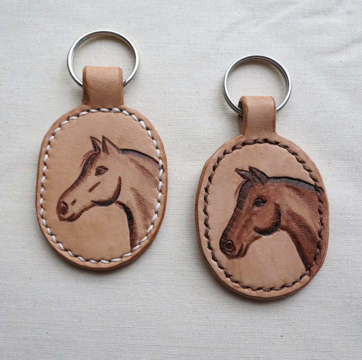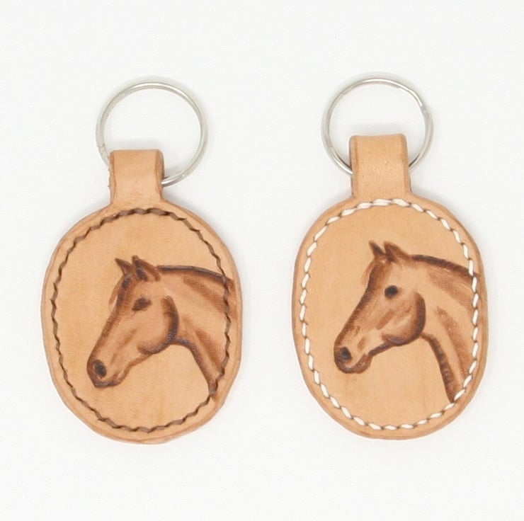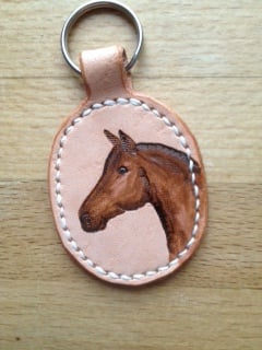 This leather key fob / key ring is made from quality natural veg-tanned leather and has a horse's head embossed and painted on it, making it a perfect gift for a horse lover.