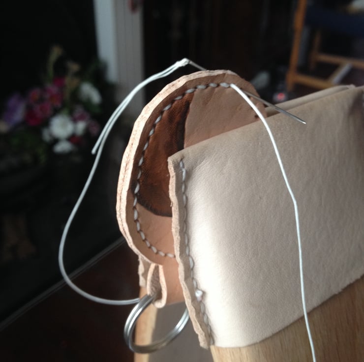 The motif is hand-drawn, which makes every image unique. The details are stamped out using special leather embossing tools. The motif is then painted with a brown leather dye. The key fob is stitched securely in place, by hand, using traditional saddle stitching. The edges are burnished to make them smooth and shiny, and the whole thing is rubbed with a leather waterproofing solution to protect the design and the key ring.