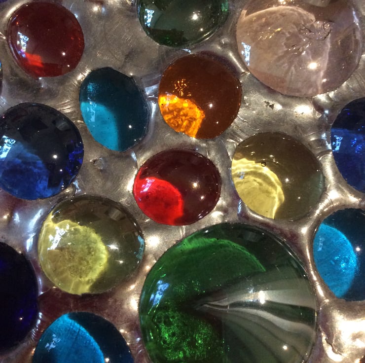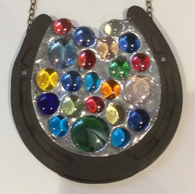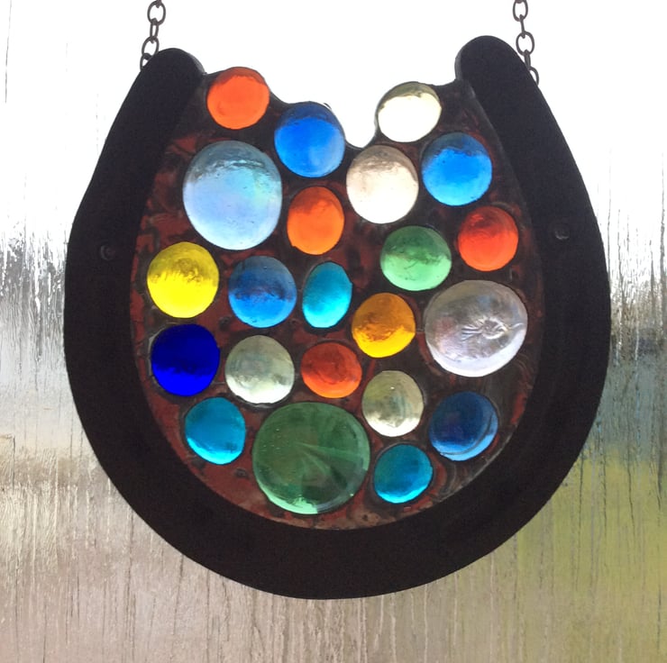 A cast iron decorative horse shoe has been filled with multi coloured glass nuggets with each component wrapped in copper foil and then solidly soldered together to form this unique suncatcher.