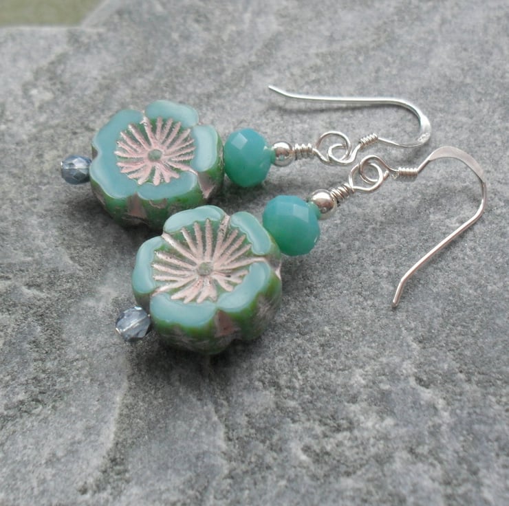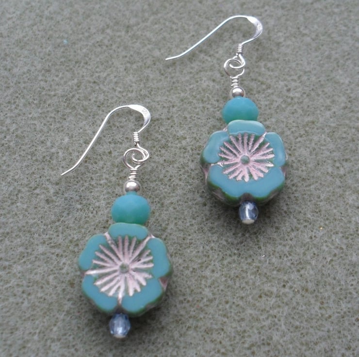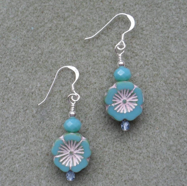 Czech glass flower beads, glass crystals and small fire polished beads are attached to sterling silver ear wires