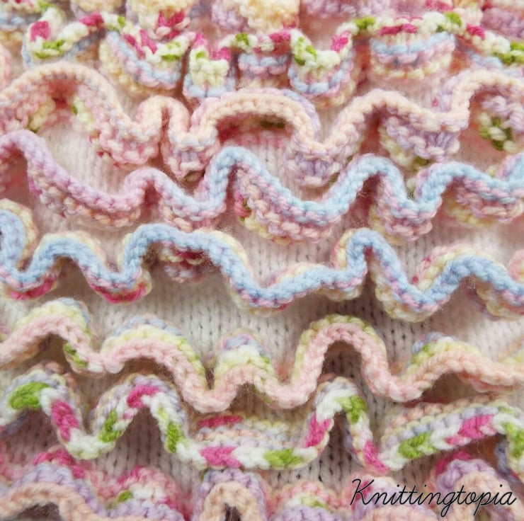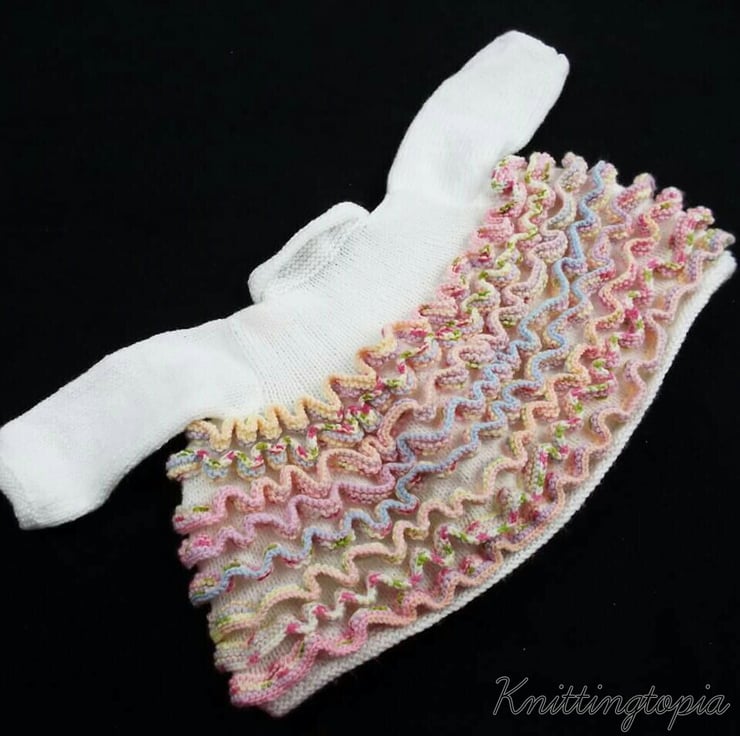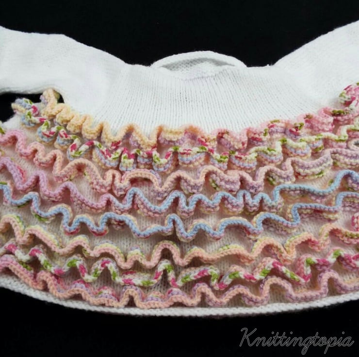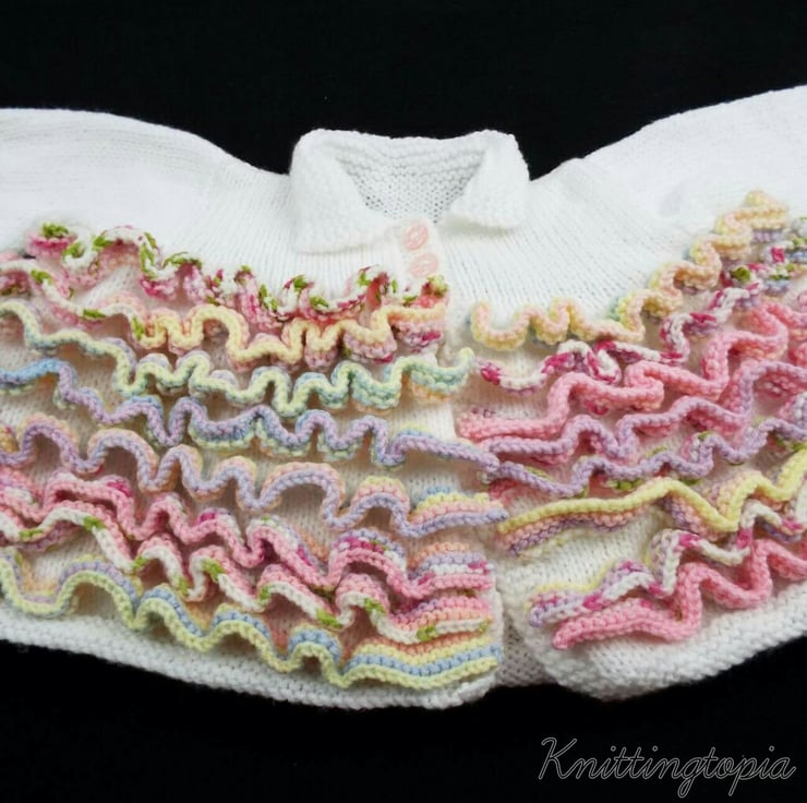 This pretty cardigan has been hand knitted with a base colour of white. It has a very full body to it which has been filled with beautiful ruffles. There are eight ruffles in total and they have been knitted using a variegated yarn in shades of pink, blue, green, peach and white.