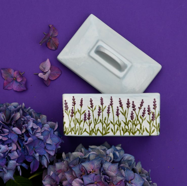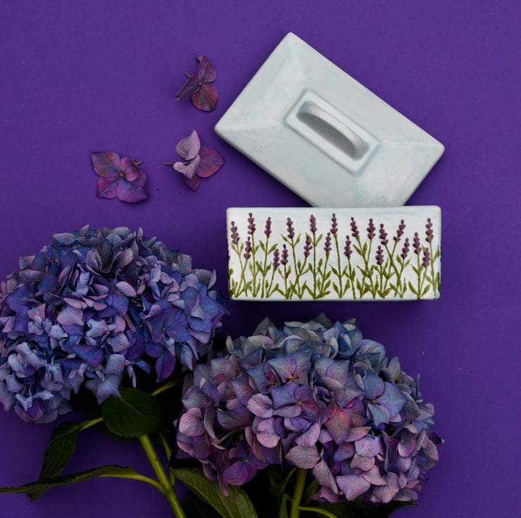 Lavender Butter Dish has a pale blue background with hand painted lavender around the dish and a pale blue lid.