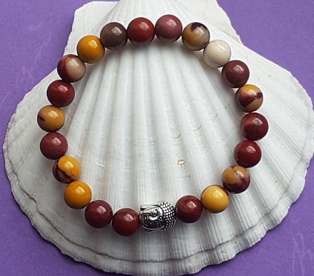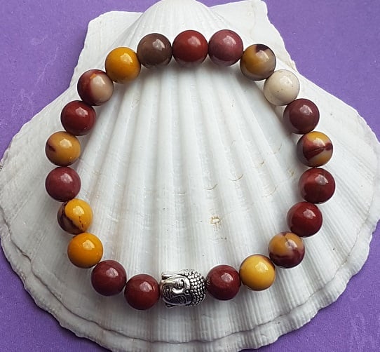 Beautiful Mookite beads and Silver tone Buddha head make up this fabulous stretch bracelet. Mookite is a stone from Australia and ranges from Off-White through Yellow right up to Red and Brown. Unusual and unique.