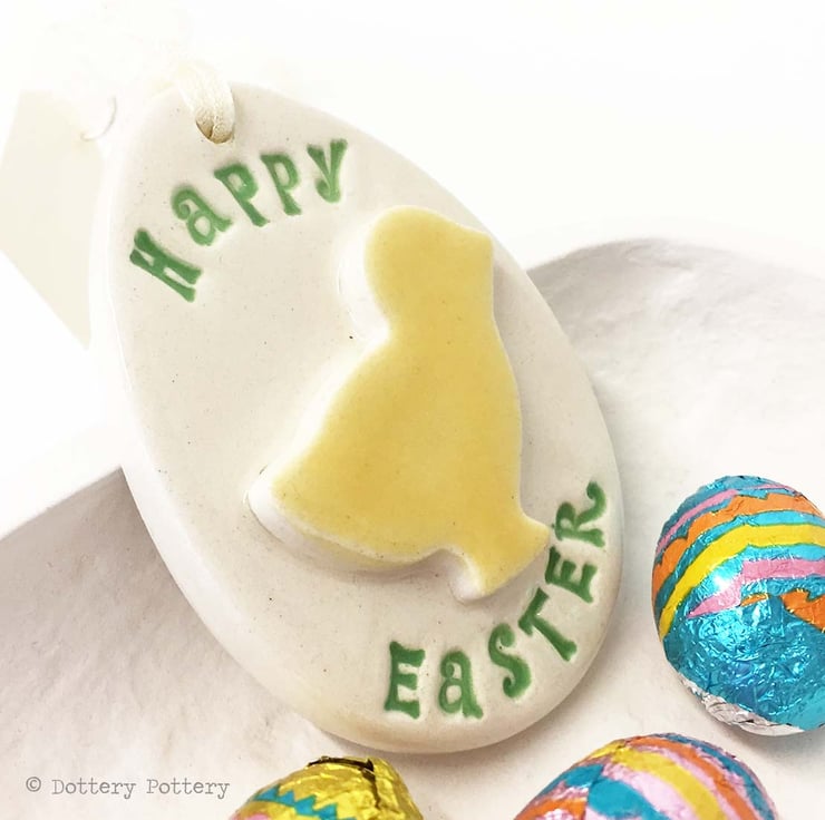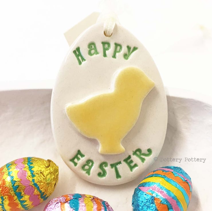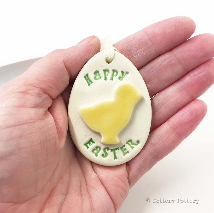 This cute little pottery Easter Egg decoration is made from white earthenware clay, fired once, a rich glossy green glaze is applied and it is then fired again - so is nice and strong.