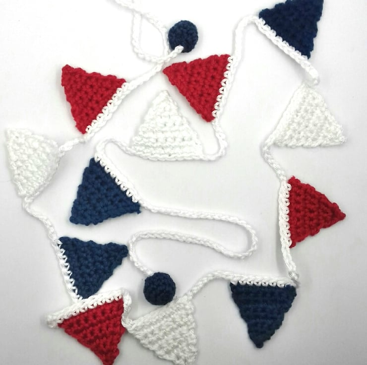 This string of mini flags is crocheted in cotton and has a crocheted bobble each end for easy tying. The garland measures approximately 120 cm long and is perfect for holding your own Royal Wedding celebration in May should your invitation, like mine, get lost in the post! The bunting comes wrapped in tissue in a labelled PIP ( Postage in Proportion ) box all ready to be given or posted on if required.
