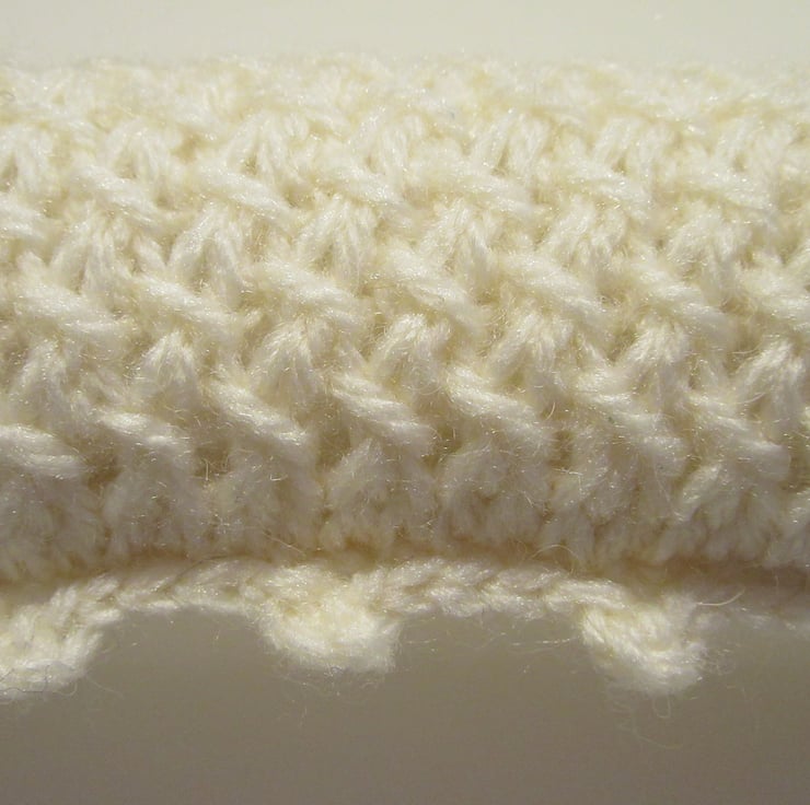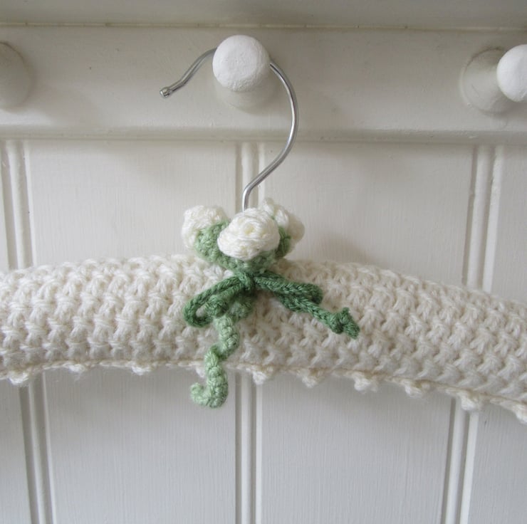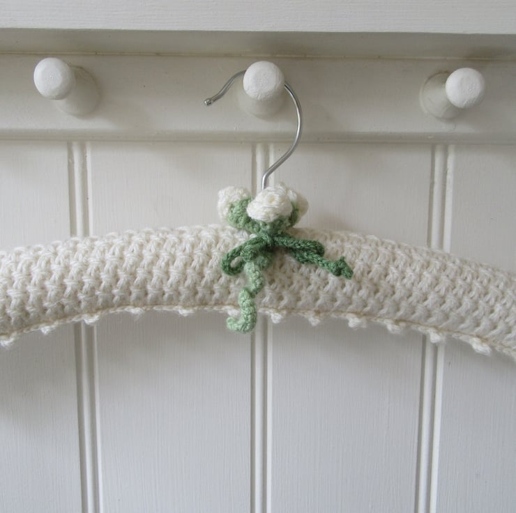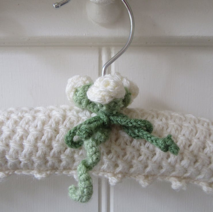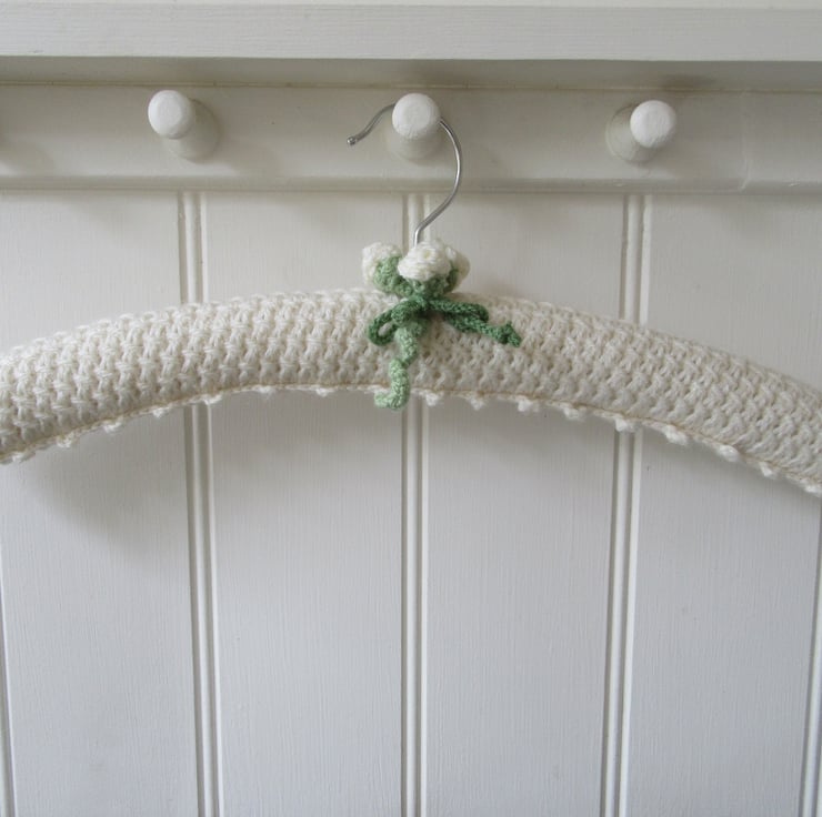 A hand knitted padded cream coat hanger with knitted bobble rose buds, the cover is hand knitted in cream coloured yarn using a delicate lace stitch. The bottom has a cream coloured crocheted picot edge.Under the metal hook nestles a trio of cream rose buds, with pale green stems, tied together with a bow in a forest green hand made cord.