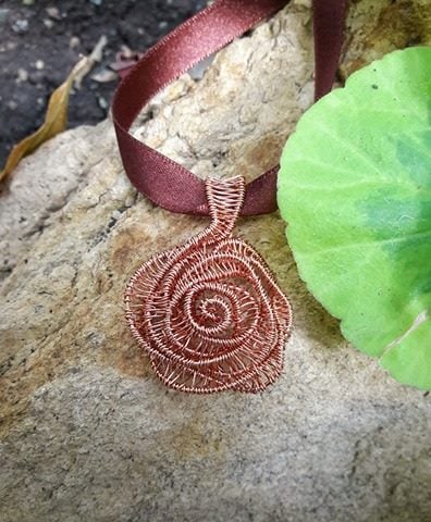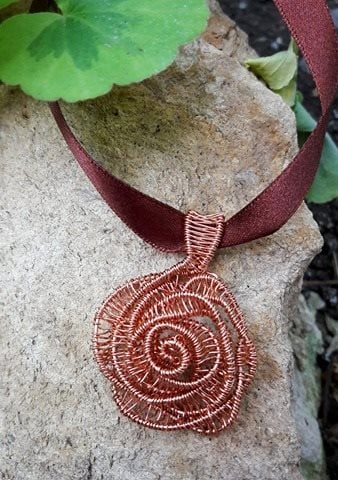 Copper Wire wrapped Rose Pendant on a pretty Satin Ribbon necklace. The Rose Pendant has been made by weaving fine wire, around two long lengths of thicker base wires, in a figure of eight pattern. The Rose is then delicately folded and wrapped to produce this stunning, Country Garden inspired Necklace.