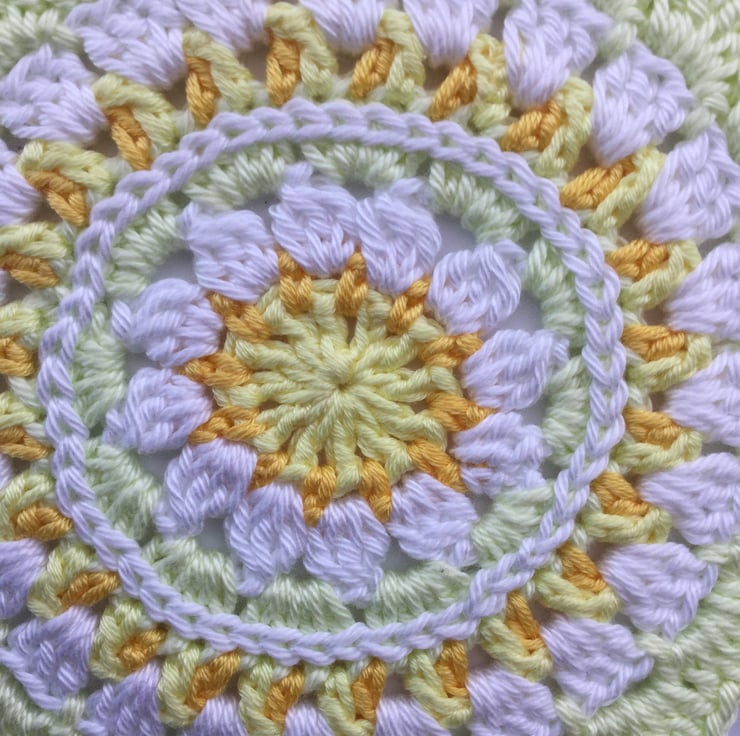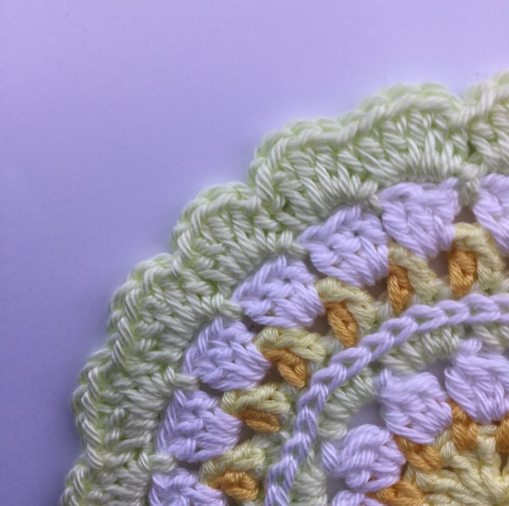 I have crocheted this little Mandala style table mat using pale green, yellow, golden yellow and white 100% cotton yarn.