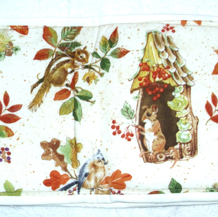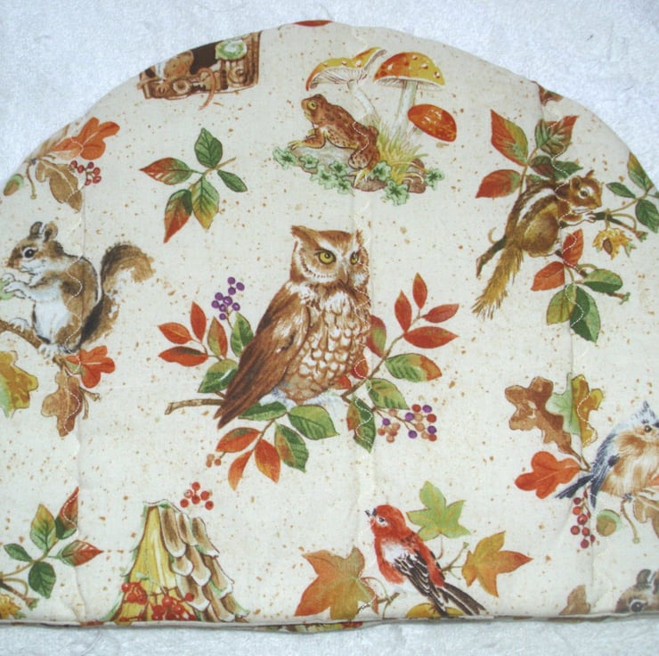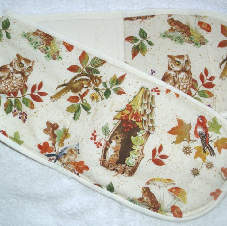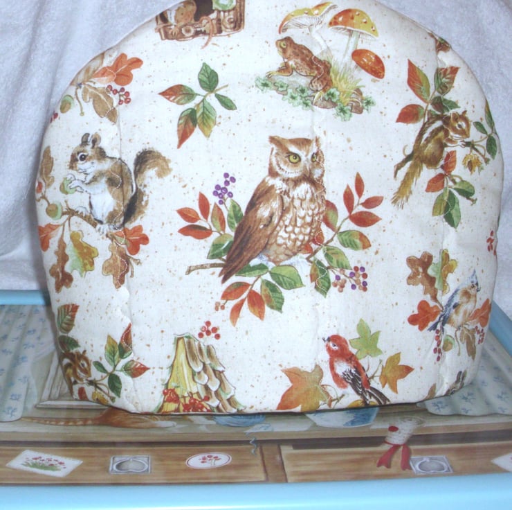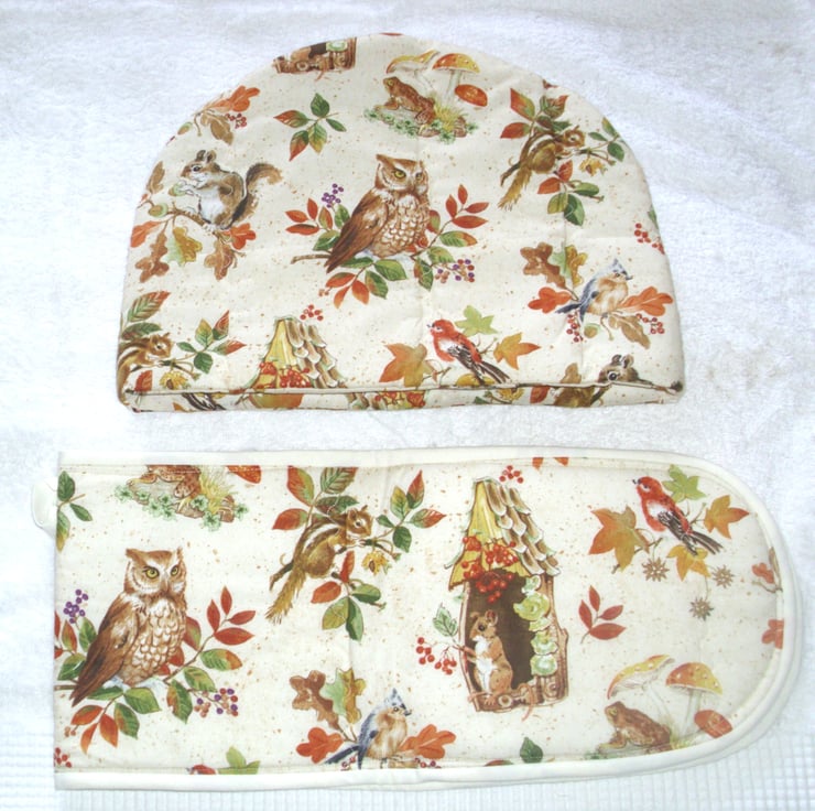 Woodland friends Tea cosy and ovengloves with owls, little mice, frogs, squirrels and pretty little birds among autumnal leaves and fruit. Tea cosy , size 31cm wide , 26cm high , will keep tea hot for up to half an hour after it is made . oven gloves are lined with heatproof material and are ideal to use with oven or microwave cooking.