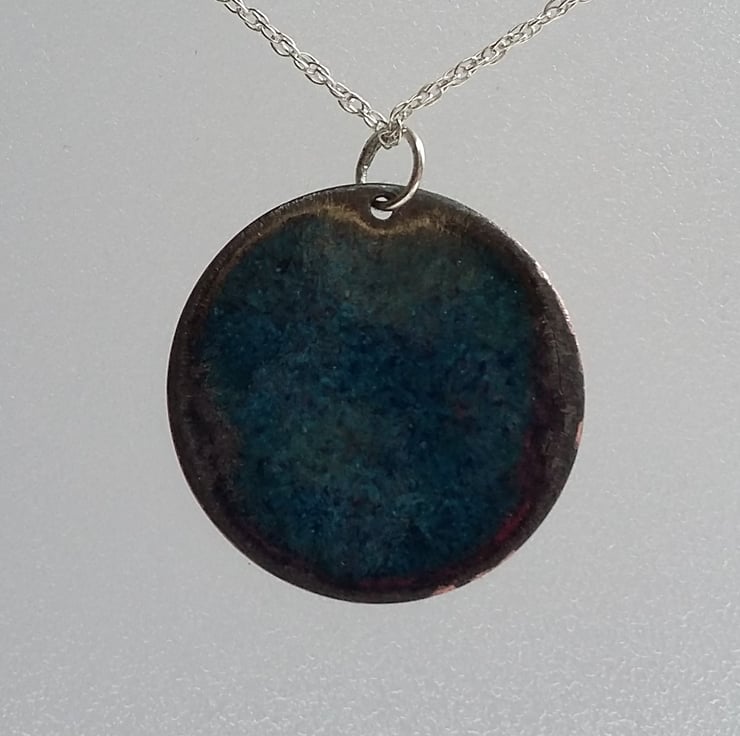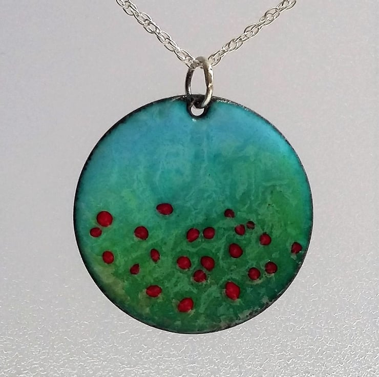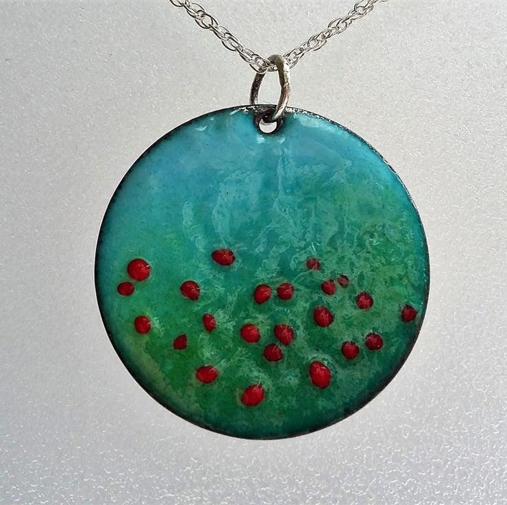 Round enamelled copper pendant in soft shades of green and blue overlaid with ‘poppies’ in red enamel. The pendant has been kiln-fired and measures approximately 30mm in diameter. The back has been enamelled to give a dark blue tweed effect. It comes complete with an 18” sterling silver rope chain with a soldered sterling silver jump ring and is supplied with a little organza pouch. POSTAGE IS FREE!