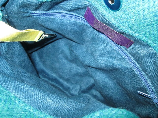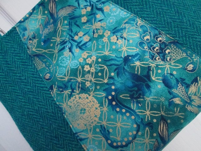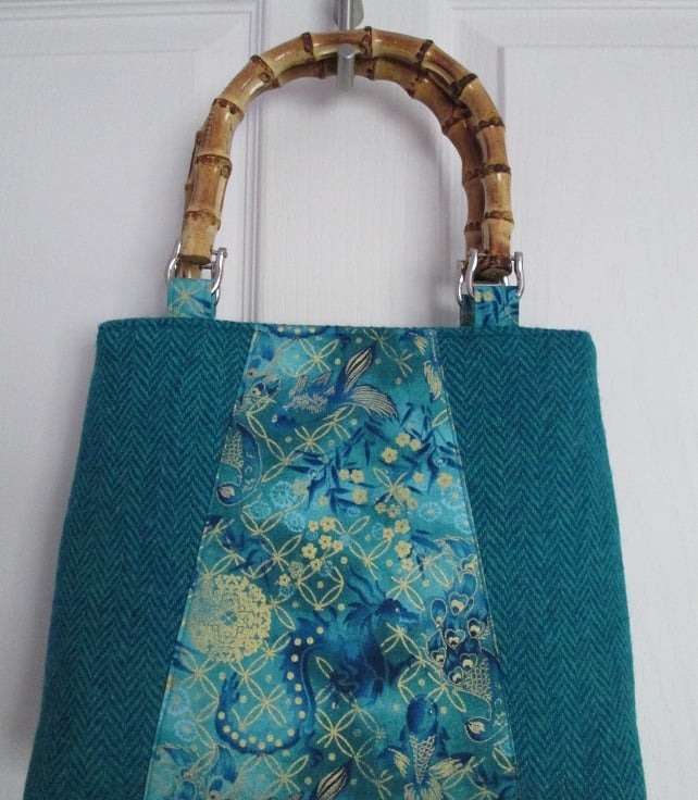 This is a rather special, 'one of a kind' handbag. When the beautiful, handwoven, turquoise 'Harris Tweed', arrived from Shawbost Weavers on the Isle of Lewis I realised it was a perfect colour match for one of my favourite oriental prints, and that I simply had to make a bag featuring both fabrics.