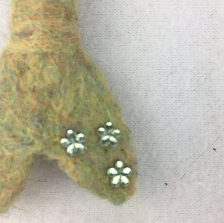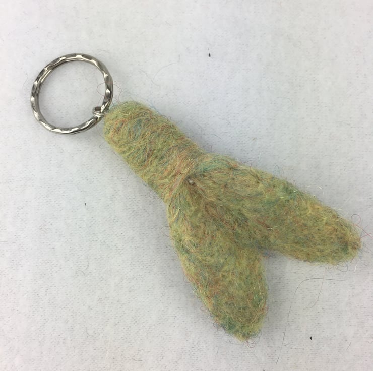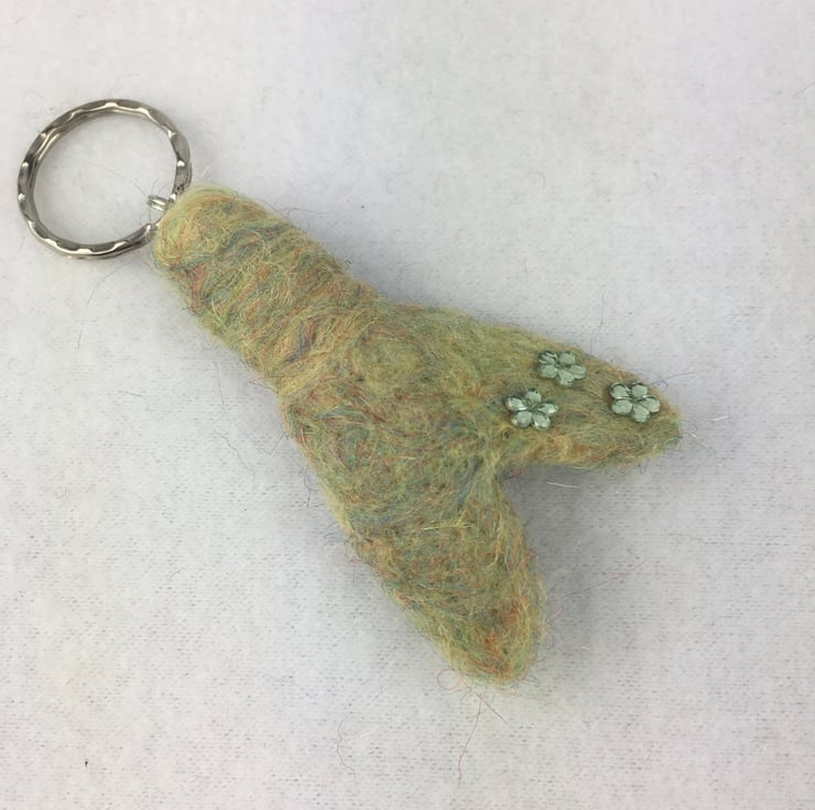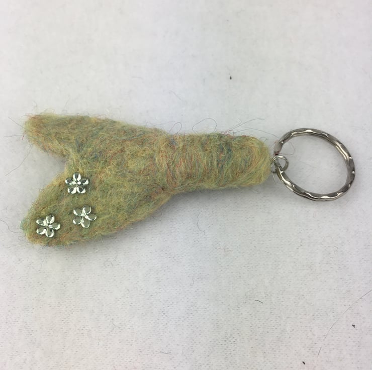 A blend of green and yellow merino wool fibres and angelina fibres have been used to create this mermaids' tail. Using a needle felting technique the fibres have been shaped with a barbed needle. The addition of the angelina fibres adds a slight sparkle and in addition 3 small acrylic floral gems have been added to the tail on one side. A 20mm silver coloured key ring has also been added. As well as a keyring this mermaid tail could also be used and a bag charm or zipper pull. The key fob measures approximately 7cm ( 3") long (excluding keyring) by 5cm (2") wide.