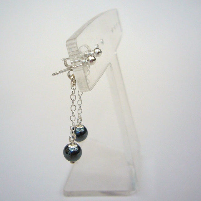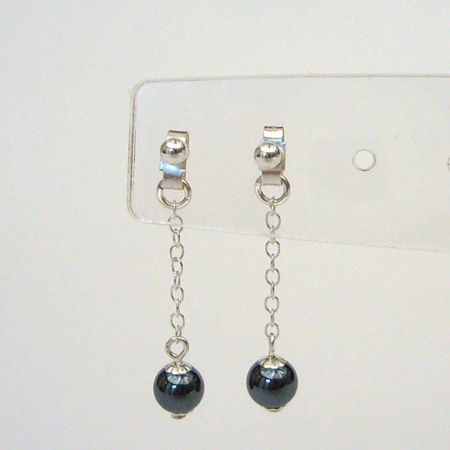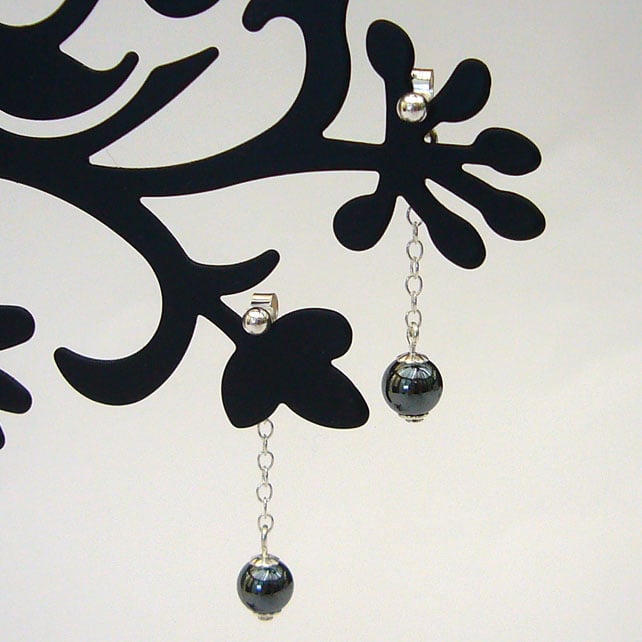 These are simple earrings with haematite stone beads and sterling silver ball studs. The beads are on chain that is attached to the earring scroll and the drop is approximately 3cm in length.