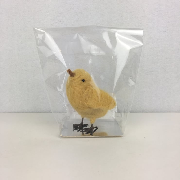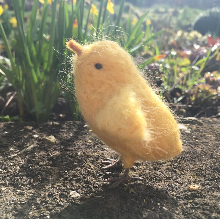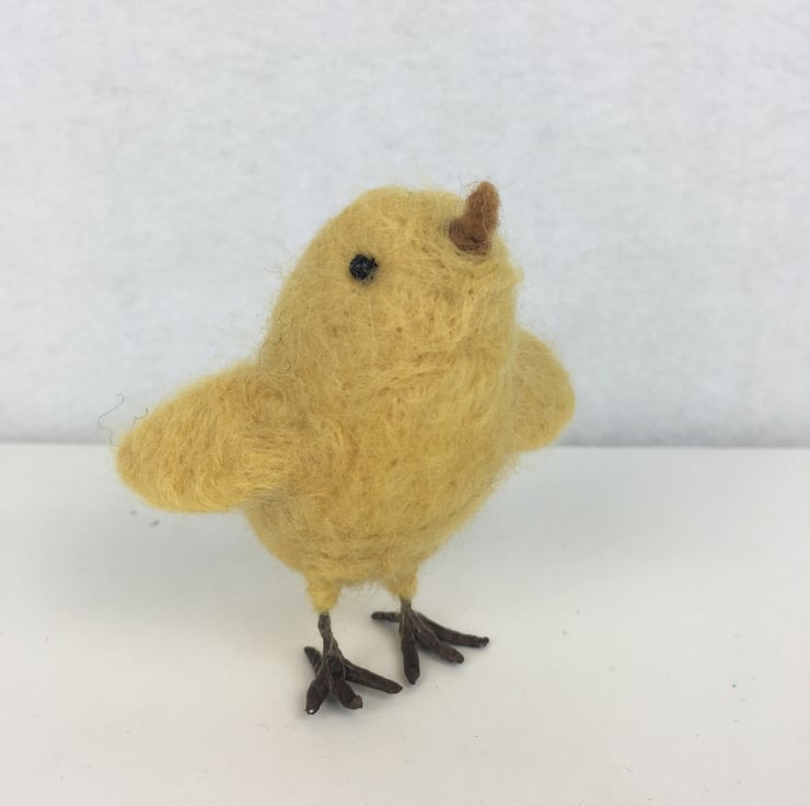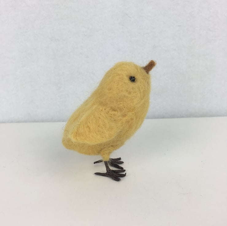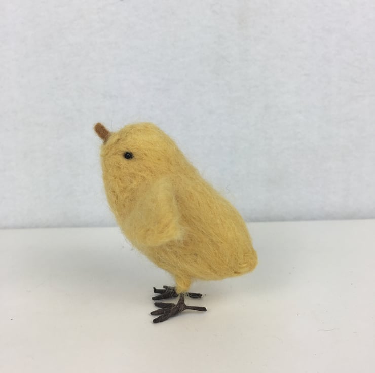 This chick has been needle felted using yellow merino wool fibres over a core wool base. He has black beaded eyes and wrapped wire feet. The chick stands approximately 7cm (2.75") tall.