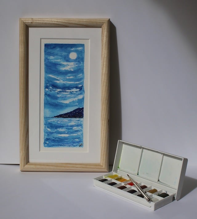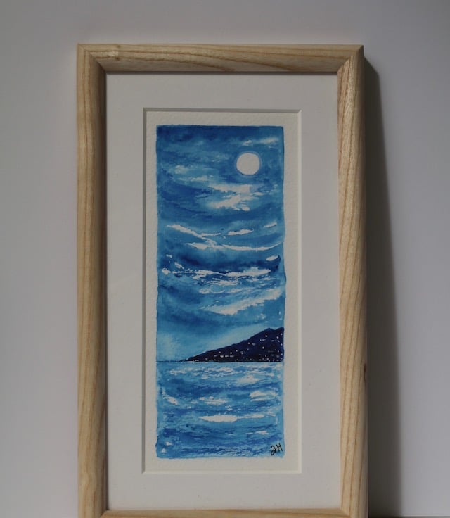 A 7x18 cm original watercolour of a beautiful moonlit seascape looking across the bay to the twinkling lights on the headland.