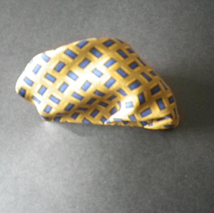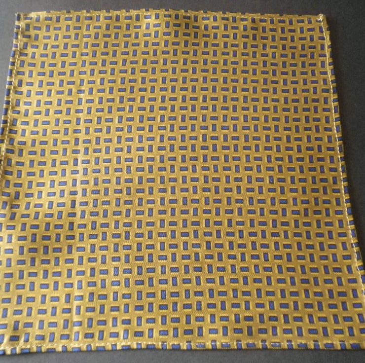 Beautiful rich, gold/mustard/navy combination, pure vintage English woven silk, tissue wrapped, measures 9" x 9", would make a super gift for a wide variety of occasions
