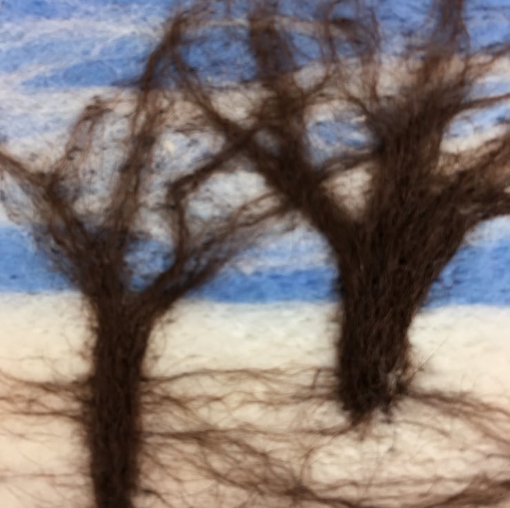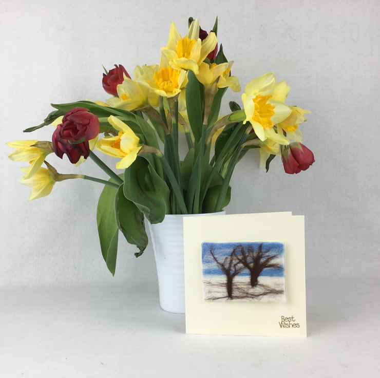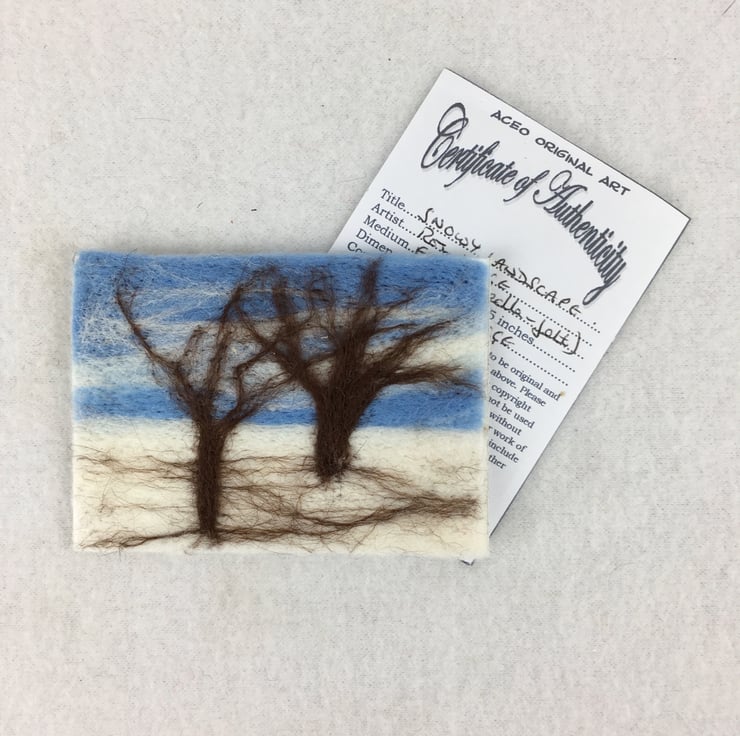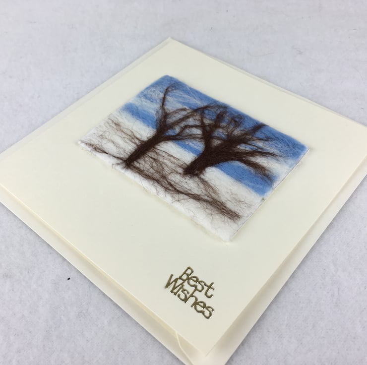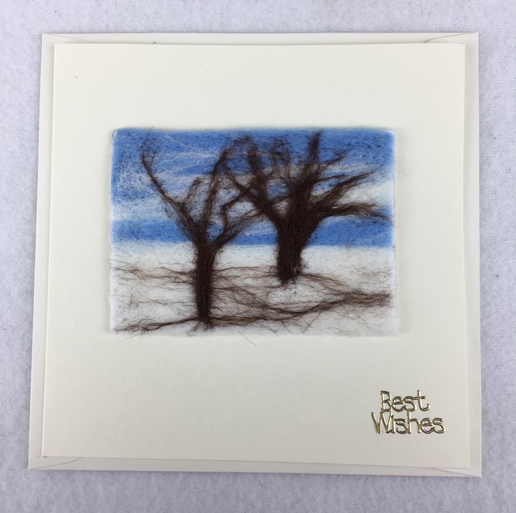 A needle felted ACEO sized (2.5" x 3.5") picture of a snowy landscape has been used to make this greetings card. The ACEO has been mounted on a 5" x 5" white greetings card with the wording " Best Wishes" in gold coloured lettering in the bottom right hand corner. The card has been left blank inside for your own message.